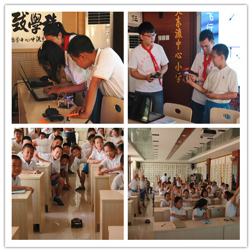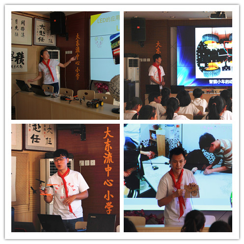 随后,我校4名科普志愿者分别围绕着水晶球的基本部件——十字旋转LED、LED作品制作、智能小车以及四旋翼飞行器的设计原理、功能、应用等进行介绍。现场同学非常踊跃,积极和志愿者们进行问题回答和现场操作方面的互动。活动后,参加活动的四年级1班同学王子仪同学高兴地说:今天这个科普课非常有趣,让我学会了很多知识,我亲手在十字旋转LED上转出我们班级的名字,看到了智能小车在我们的控制下在教室里来回走动,我最喜欢那个四旋翼飞行器,希望将来自己也可以像大哥哥一样,亲手做一个这样的飞行器,谢谢各位大哥哥大姐姐带给我们这份特殊的儿童节礼物。参加本次活动的我校科普志愿者张启宁活动后感慨的说:第一次作为一个“老师”上台,本来我特别紧张,但看到孩子们那么积极踊跃,顿时觉得自己之前在老师的指导下无数次对课件的修改和试讲的努力没有白费,我希望能够有更多的机会参加到科普活动中,将这些知识讲给更多的小朋友们听。
