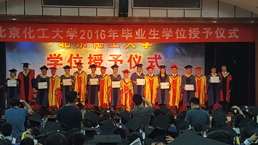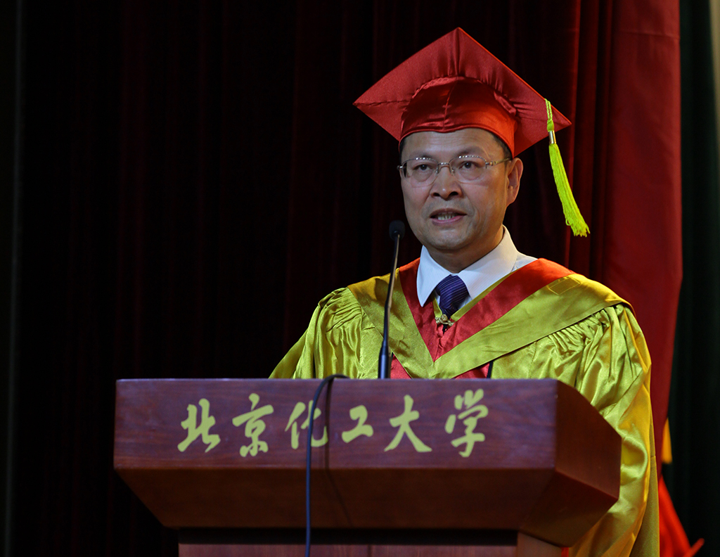 下午,博士学位授予仪式在科学会堂隆重开始。首先,校领导与相关学院院长、导师代表、毕业生亲属以热烈的掌声欢迎博士毕业生入场,给予他们崇高的荣誉,紧接着一首《忆·流年》的诗朗诵引起博士毕业生的共鸣,诗歌充分表达了对母校的留恋与感恩之情。陈标华副校长宣读了十四位获得优秀博士学位论文毕业生名单。随后化工学院、材料科学与工程学院、机电学院、信息学院、理学院、生命学院院长宣读了博士学位获得者、博士论文题目及指导教师名录,王芳书记、谭天伟校长为博士学位获得者颁发了学位证书。最后谭天伟校长发表了题为《创新、责任、担当》的毕业寄语。他鼓励广大研究生在以后的工作中,努力做到以下几点:一是不断创新。无论走到哪里,都要时刻保持“板凳要坐十年冷,文章不写半句空”的态度,不断追求,不断创新,为社会发展进步贡献应有力量。二是勇于担当。担当是一种责任、觉悟、境界与修养。勇于担当不是逞匹夫之勇,更要有着眼大局的视野,创造性的解决问题的能力。三是永不言弃。在任何事情与挫折面前,要敢于坚持,经历就是一个成长的过程,是获得不同的感悟,积累成长过程的机会,成功的关键就在于坚持。仪式在母校之光的歌声中圆满结束。会前全体博士生在母校之光前与领导、导师代表合影留念。