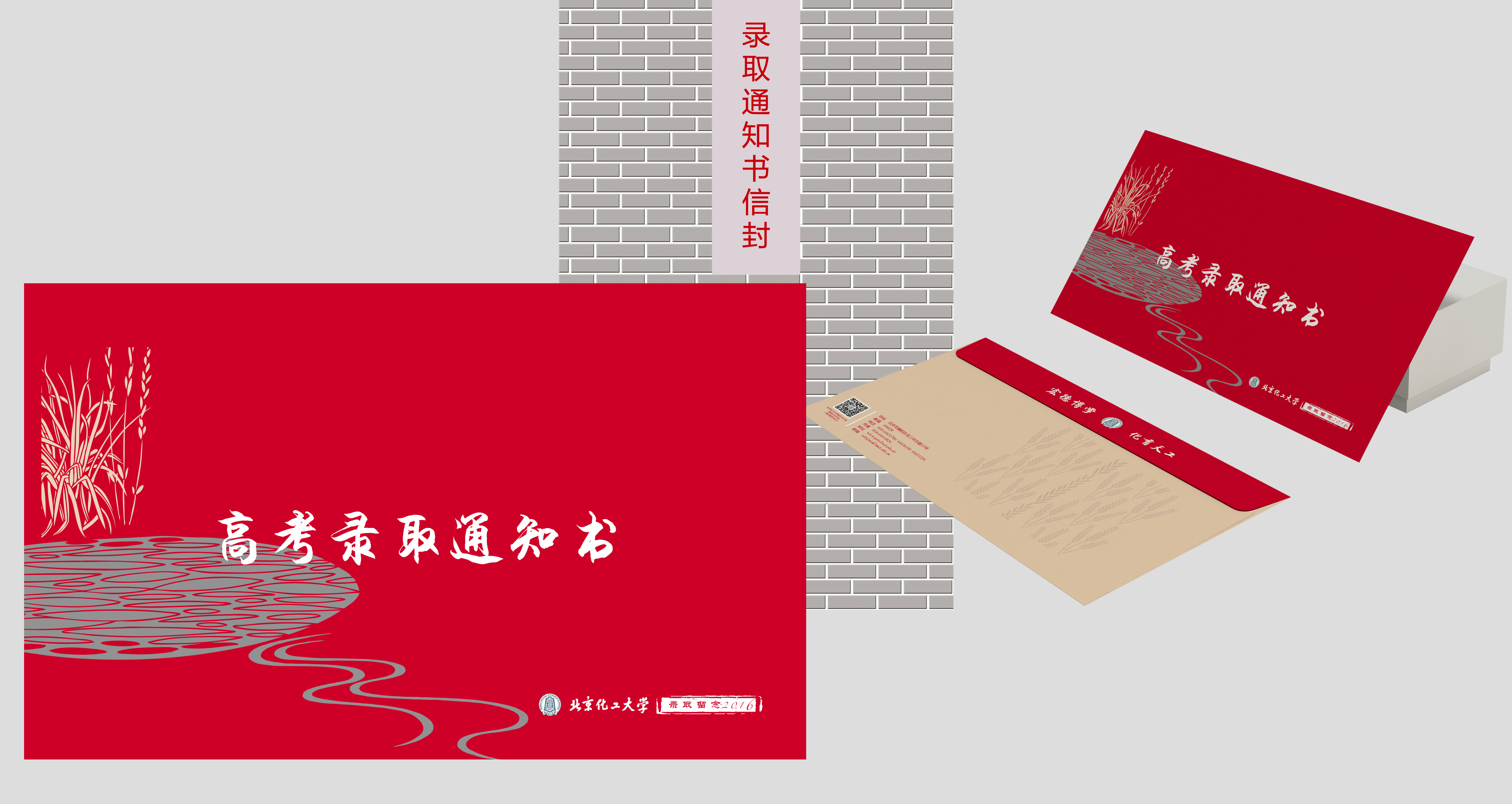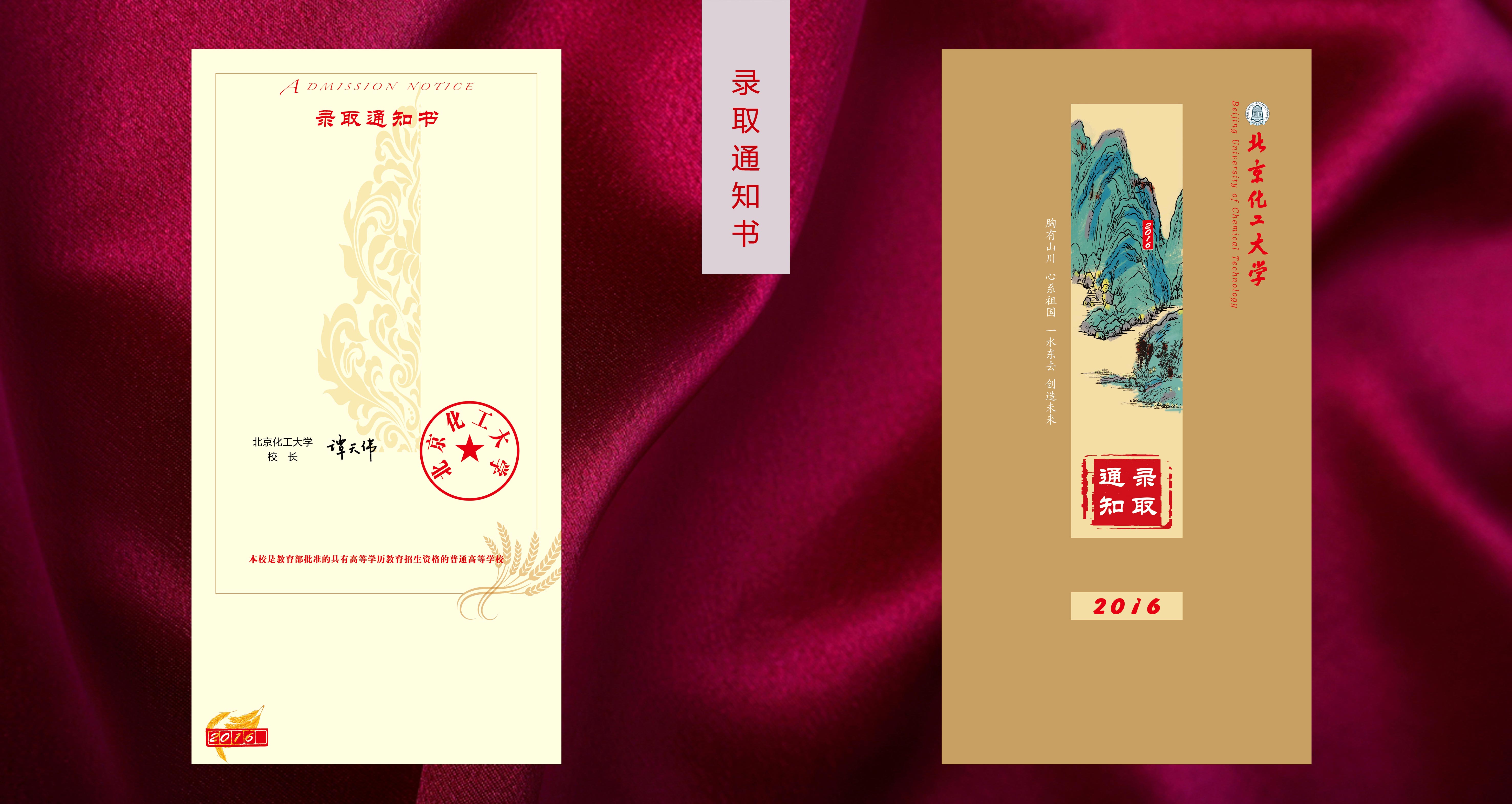 北京化工大学2016年高考录取通知书等系列材料(包括EMS、录取通知书及信封、新生入学指归、书签等)采用了麦子、麦地和自然山水设计元素,意在借麦子、麦地和自然山水意象,反映北京化工大学的大学观、大学知识观以及大学的教育理念,反映作为国家化学化工事业发展科技研发以及人才培养的前沿和基础领域,北京化工大学应当展示其对化学化工事业永续发展的认识态度。