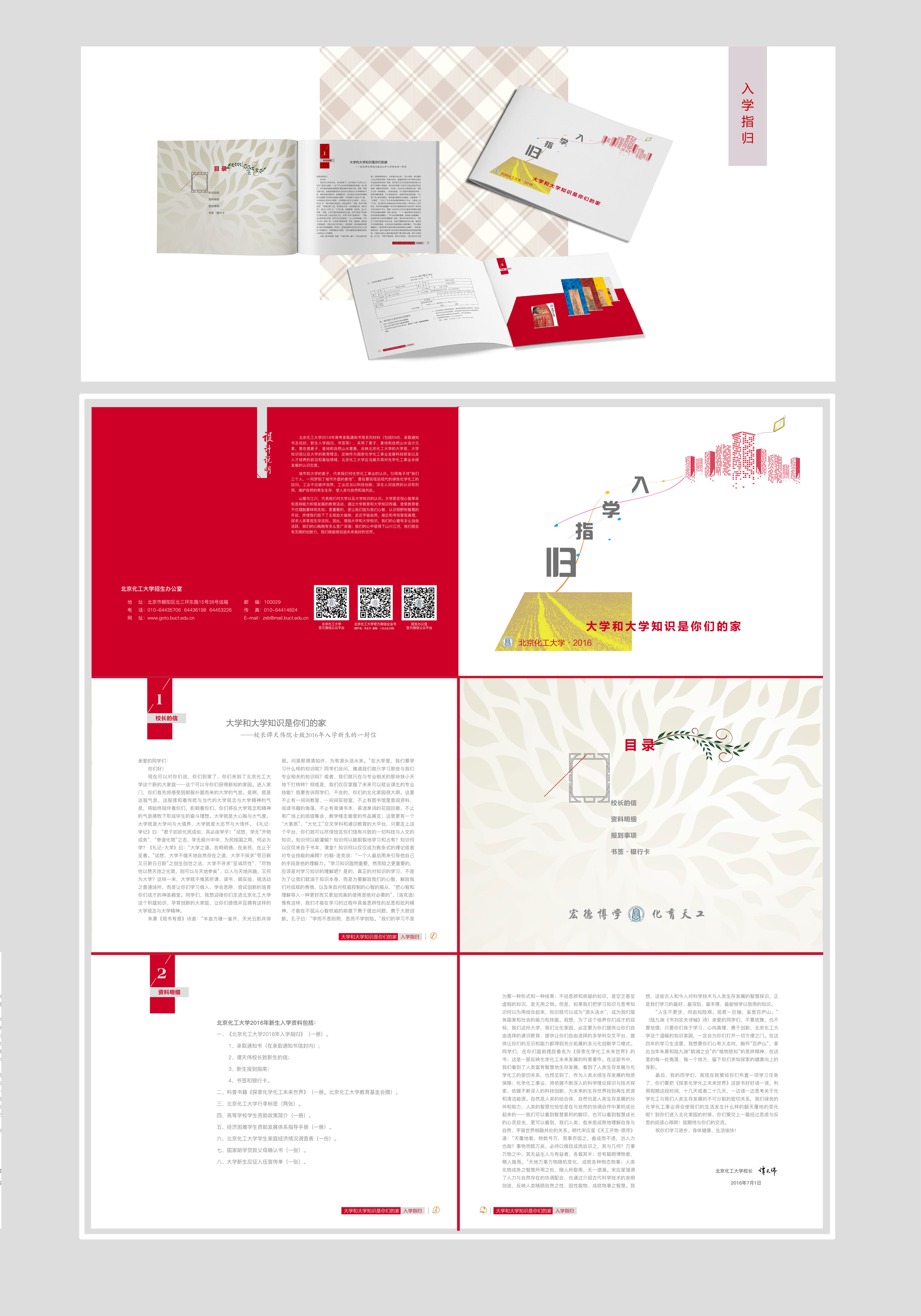 直至7月6日,北京化工大学2016年高考录取通知书等系列材料的设计工作全部完成。为了进一步强调学校办学理念、突显学校文化特色,进一步将招生工作与学校文化宣传展示工作紧密联系起来,招生办公室专门成立了由文法学院唐帼丽教授和招生办公室主任许海军任组长的文化形象设计工作组。工作组首先明确了“主题设计,意象烘托,集中反映北京化工大学‘宏德博学、化育天工’的大学思想和育人精神”理念;围绕设计理念,借助鲜明而富抽象象征意义的意象图像及符号,将学校的大学观念、求知态度以及“知行合一”学以致用的治学思想,反映并实现在北京化工大学2016年高考录取通知书等系列材料上面。通过此番设计工作,学校将不仅仅为每一名2016级北京化工大学的录取新生发放高考录取通知书,更重要的,是向我们的学生——这些洋溢着青春热血、渴望求知报国的青年学子,传递出一种认识大学、思考大学、体悟大学精神、沉淀于大学厚重知识积蕴、养成“知行合一”实践能力的深沉大学观念;让我们的新生,在捧取录取通知书的同时,不仅仅是耽于考取大学的快乐,更拥有一份思考大学与社会、大学与祖国、大学与价值观和信念观何以具有密切关系的沉甸甸的人生责任和理性思考。北京化工大学是一所具有理工科背景的综合类高校;但在学校的认识理念中,北京化工大学首先是融人文与科技为一体的展示其“大化工”、“大素质”通识教育办学思想的育人家园。这所大学没有浮夸,惟有求真务实;这所大学没有学科壁垒,惟有学科交叉与通识教育的理、工、文融合;这所大学不惟获取专业知识与技能为是,惟有播育思想和学识、孕育文化与科学、培育务求真理与创新的富有传统与当代文化结合意义的大学教育。这所大学的真正精神气质,一定要在它的每一处对外展示与交流的细节上渗透并洋溢出来!