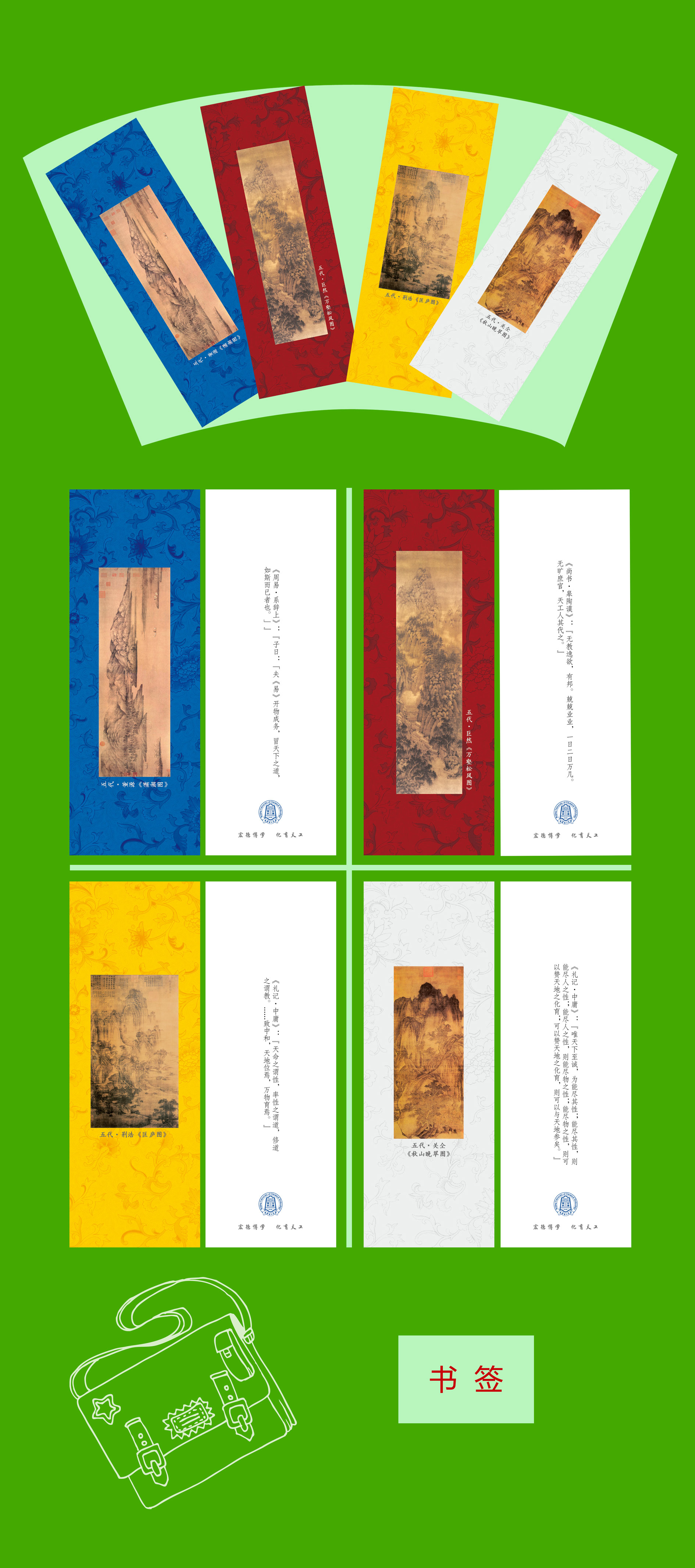 此次系列材料包含了书签设计。书签共有四张,按照中国传统五行元素所具颜色对应排列,分别为蓝、红、黄、灰(融合白色与黑色)色。书签正面均选用了中国五代画家的山水画作,分别是:五代•董源《潇湘图》(蓝色),五代•巨然《万壑松风图》(红色),五代•荆浩《匡庐图》(黄色),五代•关仝《秋山晚翠图》(灰色)。选用中国古代山水画作,意在借自然山水意象,进一步呼应录取通知书中所设计的山川壮景,进一步从侧面烘托学校对当今以至未来的绿色化学化工事业的理解以及学校对培育科技创新人才、孵化创新团队和创新成果、占据国家发展科技前沿所勇于担纲教育责任的气魄和胸怀。选用古代著名山水画家的画作,也意在强调学校对传统文化的理解和传承,强调作为当代人,我们应当学习和领悟传统精神之“天人合一”、“赞天地之化育”、“与天地参矣”之人类与自然交融的宇宙自然观。