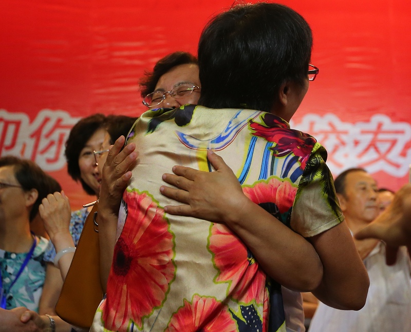 在信息学院的签到台前,十几位穿着统一服装的中年人在热情洋溢地握手,聊天,拥抱。他们是自动化921班的同学们。据校友们集体回忆说,他们当时最难忘的经历就是军训了。“20年前只有东区这一个校区,我们那时候军训是在现在的昌平校区进行的,那时候那边只是一片荒地,没有经过任何开发,现在已经发生了翻天覆地的变化”。一名吴姓校友回忆说。开始回忆军训之后,同学们仿佛打开了话匣子,又回忆起其他趣事。“军训之后,我们又举办了一次植树活动,我们一个班一起到八达岭附近的山上,种了两天树,晚上升篝火,烧水,自己煮饭,当时大家都刚上大学,哪里会做饭呀,煮的鸡肉都是生的,不过大家还是都吃了,还都吃的很开心。”说到这里,大家都笑了。年轻的岁月回忆起来总是让人忍俊不禁,但又无比怀念。忆往昔峥嵘岁月稠,看今朝旖旎风光秀。