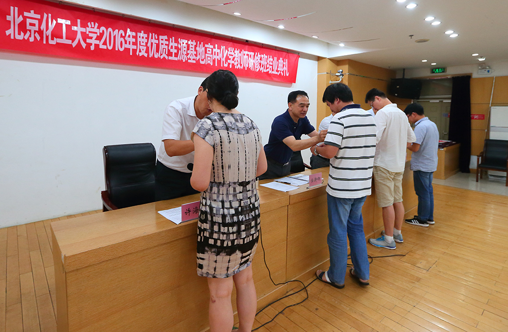 2016年7月22日下午,北京化工大学2016年度优质生源基地高中化学教师研修班结业式在我校会议中心多功能厅举行。北京化工大学党委副书记兼副校长任新钢、本科招生办公室主任许海军、继续教育学院院长王玉、合作交流处副处长刘宏伟,以及本次研修班的106名学员代表参加了结业仪式。仪式由本科招生办公室主任许海军主持。