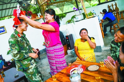 芒棒边检站所在的云南省德宏州是傣族景颇族自治州,芒棒村也是傣族聚居的村寨,为了更好地维护边境安全稳定,官兵们要经常到附近村寨走访,在节日里也会邀请村民到站里联谊,军民关系融洽。见到王禄粼的时候,傣族大姐发现他长得很像傣族小伙,特意取来节日的包头为他戴上。