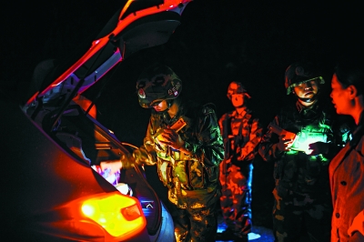 深夜12点的边境公路上,王禄粼(左一)和战友在芒棒边检站副站长孙玥(右二)带领下设卡查车。每当有车辆经过,守候在旁的战士们就会上前检查证件,搜查可疑车辆,对可疑人员进行盘问和尿检。正是这种不定时、不定地点的突击检查,对边境走私和贩毒起到了震慑作用。