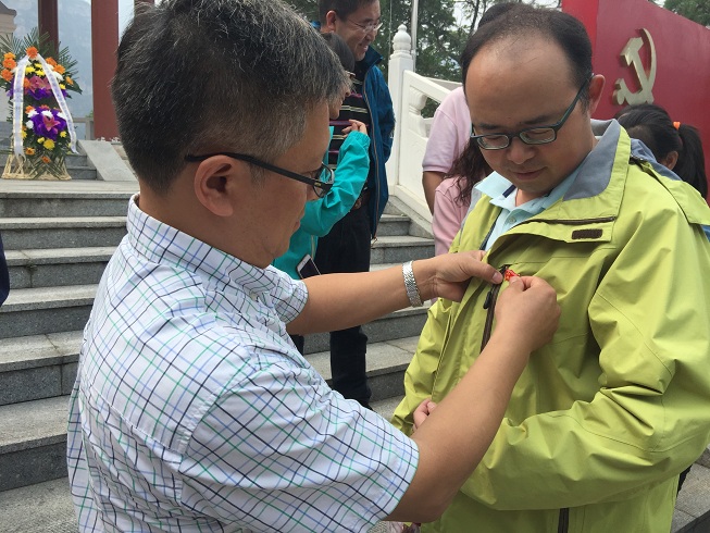 参观结束后,全体党员前往烈士纪念碑前,由党龄15年以上的老党员为新党员佩戴党徽。面对鲜红的党旗,党员们庄严地举起右手,重温入党誓词。直属党支部书记王玉指出:此次学习参观活动是开展党的“两学一做”教育实践活动的重要组成部分。今天,我们面对革命先烈,重温入党誓词,其目的就是要求我们党员同志,时刻牢记自己是一名共产党员,要以革命先烈为榜样,自觉坚定理想信念,自觉履行党员义务,不断增强党性观念,不断加强党性锻炼,不断提高自己的思想政治觉悟,时刻牢记以党员的标准严格要求自己,在各方面能够发挥模范带头作用,为学院的建设和发展做出应有的贡献。党员代表刘瑞萍老师也谈了参观纪念馆的感受,并就什么是信仰,什么是幸福做了深层次的阐述。