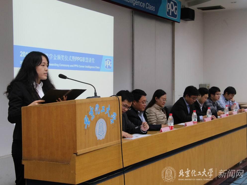 付国柱副主任宣读《2015-2016学年北京化工大学PPG专项奖学金获奖学生名单》。本年度共10名本科生荣获本项奖学金,双方领导为获奖学生颁发了北京化工大学PPG专项奖学金证书,并与获奖学生合影留念。材料学院2014级本科生郭一凡同学作为获奖学生发言,她代表获奖学生对关心我校发展并支持学生成才的PPG公司表示衷心的感谢,感谢母校的培养与教导,承诺一定会通过拼搏和努力回报企业的资助,以优异的成绩报答母校的培养。