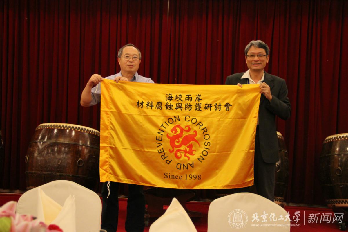 会议最后决定2018年的第十一届海峡两岸材料腐蚀与防护研讨会将由北京化工大学主办。我校左禹教授从台湾大学林招松教授手里接过会旗,并发表致辞,欢迎与会代表参加下届研讨会。相信此一已经传承十八年的海峡两岸材料腐蚀与防护盛会在北京化工大学的主办下依然精彩。
