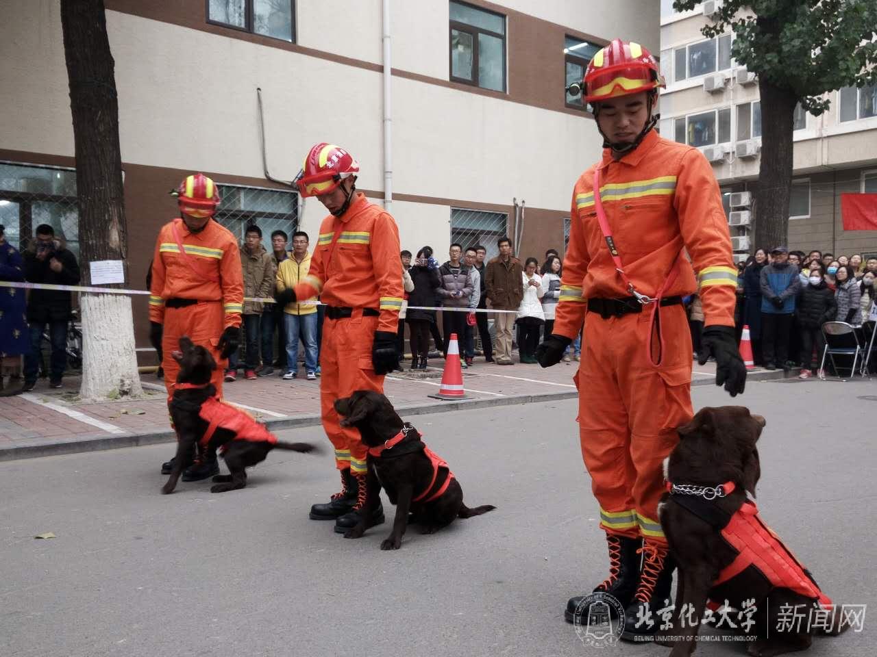 朝阳消防支队亚运村消防中队消防员接警后,三辆消防车到达现场,并向篮球场方向喷水模拟灭火,火情得到控制。消防中队向参加模拟演习的师生演练了搜救犬表演。随着消防救援人员响亮干脆的命令,三只拉布拉多搜救犬乖巧地听从救援人员的指令,迅速地坐下,然后又站起跟随救援人员奔跑。搜救犬就像一个训练有素的战士,熟练地完成了各种动作。这次消防演习中的搜救犬表演,是搜救犬在学校消防演练中的首秀。