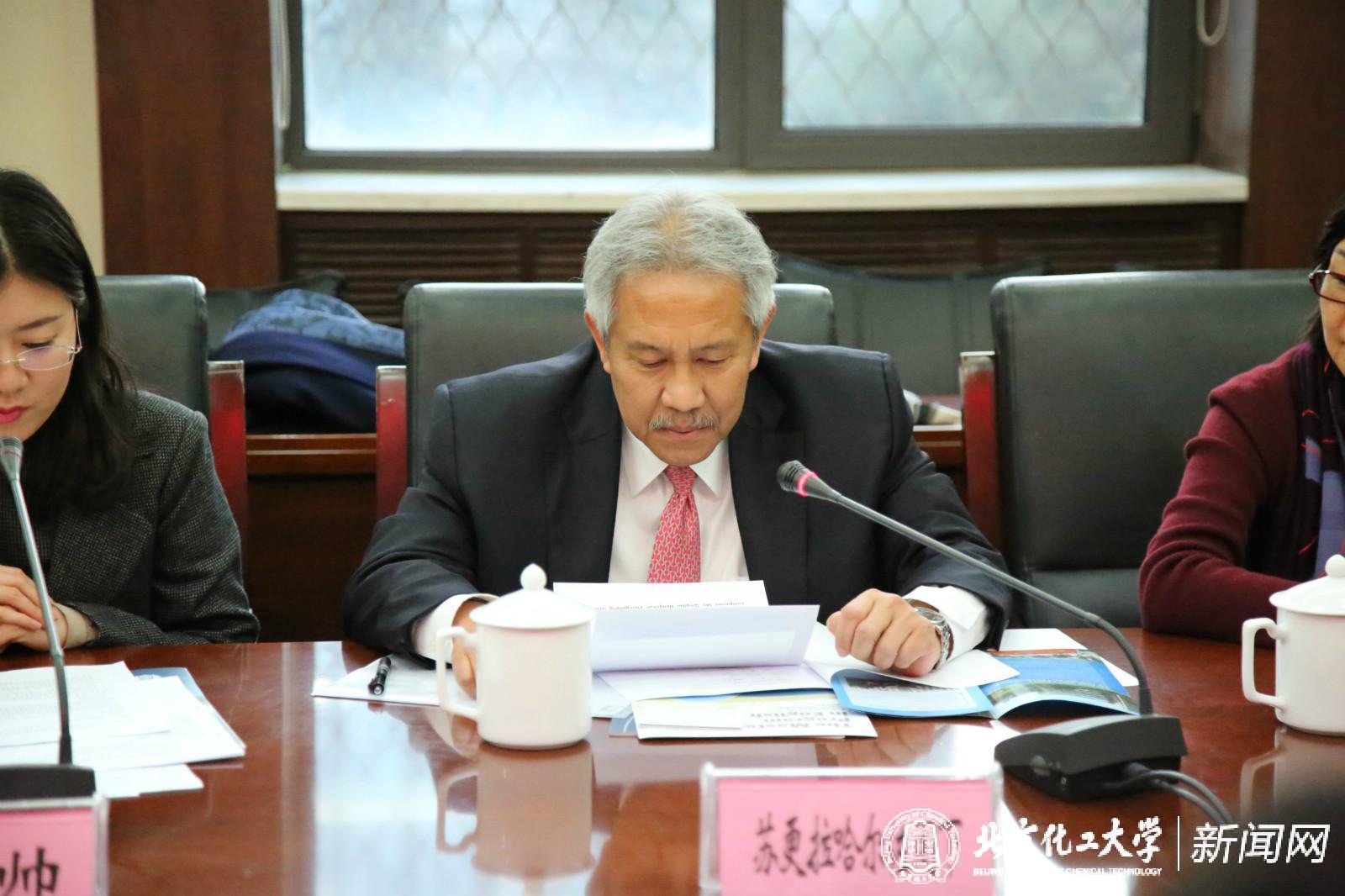 谭天伟校长对印尼驻华大使苏更•拉哈尔佐的到访和见证表示感谢,他介绍了北京化工大学的发展背景与学科特色,指出我校将积极响应国家号召,大力推进与“一带一路”沿线国家的教育合作,希望以此为契机,建立产学研合作机制,推动与印尼相关高校和企业间的深入合作并期待取得丰硕成果。