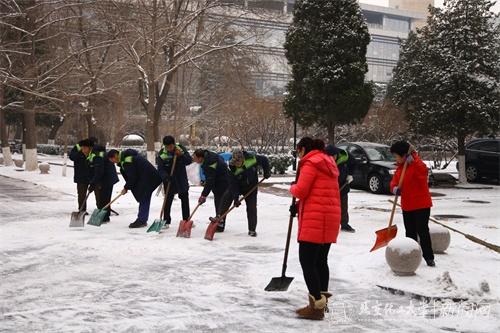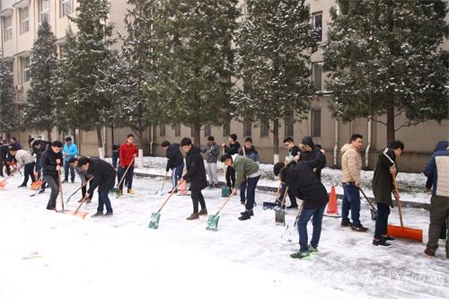 22日清晨,东、北、西三个校区的本科生、研究生在辅导员的带领下,与校院领导和教职员工一起,主动加入扫雪除冰队伍。后勤集团在相关负责人带领下,组织三校区员工开展扫雪除冰活动。校机关、相关职能部处老师,也都自发走出办公室,清除门前和主要道路的结冰与积雪。在叮咚作响的锹铲交响中,一条条被白雪覆盖的大路小径,又露出了往日光洁的笑颜,一棵棵被瑞雪压弯腰的树木又恢复挺拔的身姿。