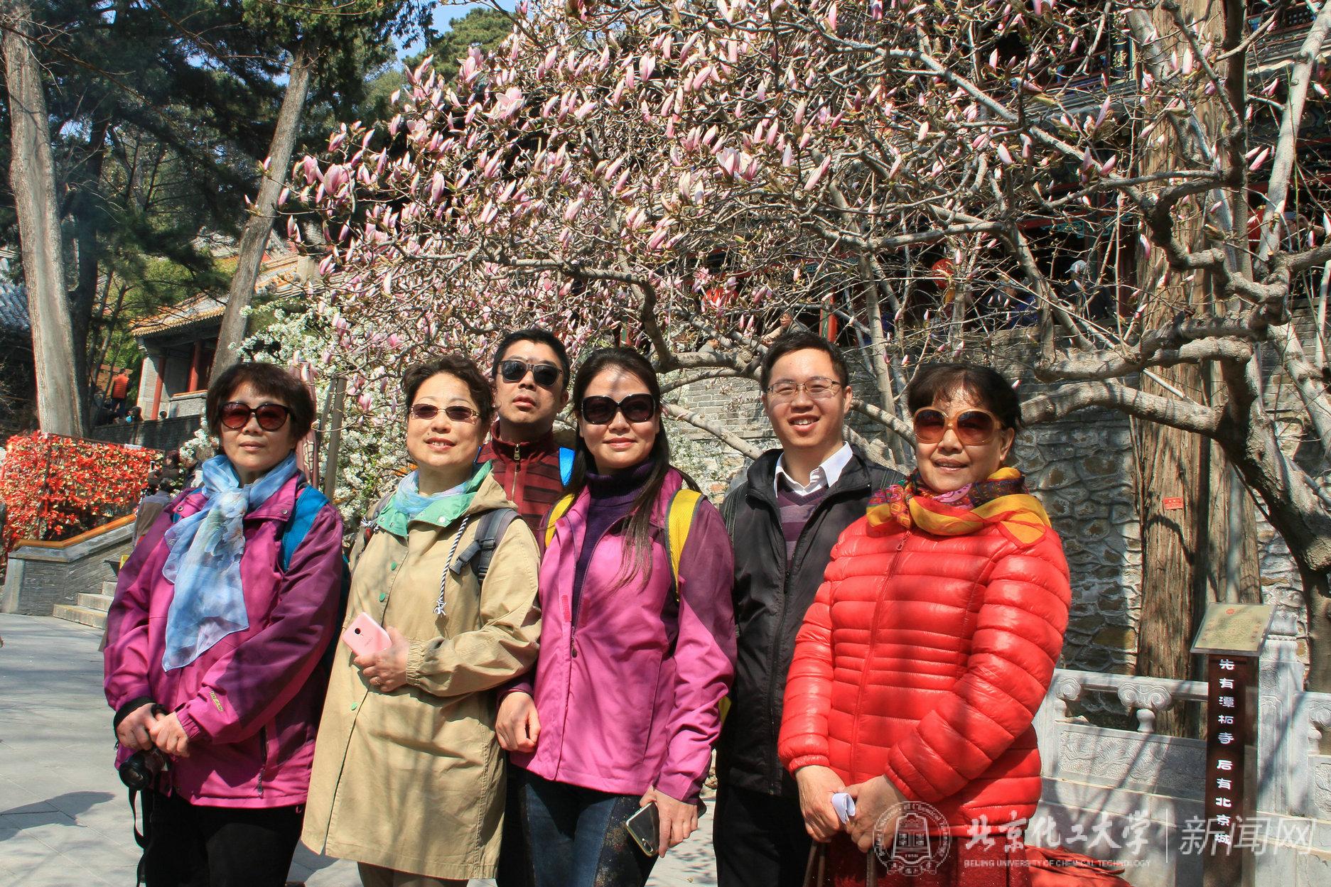 “潭柘寺”始建于西晋永嘉元年,因寺后有龙潭,山上有柘树,民间一直称为“潭柘寺”。潭柘寺距今已有1700多年历史,是北京最古老的佛教寺院,素有“先有潭柘寺,后有北京城”的民谚。寺院规模宏大,特殊的地理位置使得这里气候温暖、湿润,寺内佛塔林立,殿宇巍峨,古树参天,植被繁茂,环境极为优美。潭柘寺的“二乔玉兰”是我国迄今为止独一无二的两株明代双色玉兰,已有400余年历史,是享誉京城的名花。春游期间恰逢寺院玉兰绽放,满园馨香。老同志们纷纷观赏“二乔玉兰”的艳丽风姿,在百年玉兰树下拍照留念。春游活动中,老同志们摸石鱼祈福,逛千年殿宇,漫步观景,惬意交谈,一路欢歌笑语,互致问候,共同感受着春天的气息,享受着美好的生活。