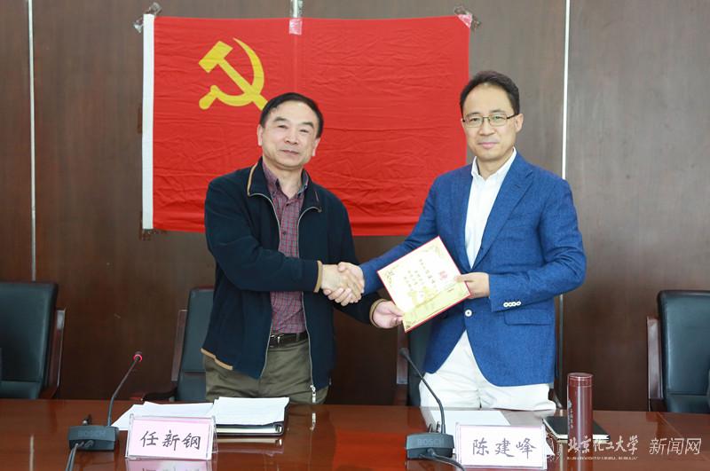 任新钢副书记为陈建峰院士颁发了青年学者“红色引擎”工程的“政治导师”聘书。
