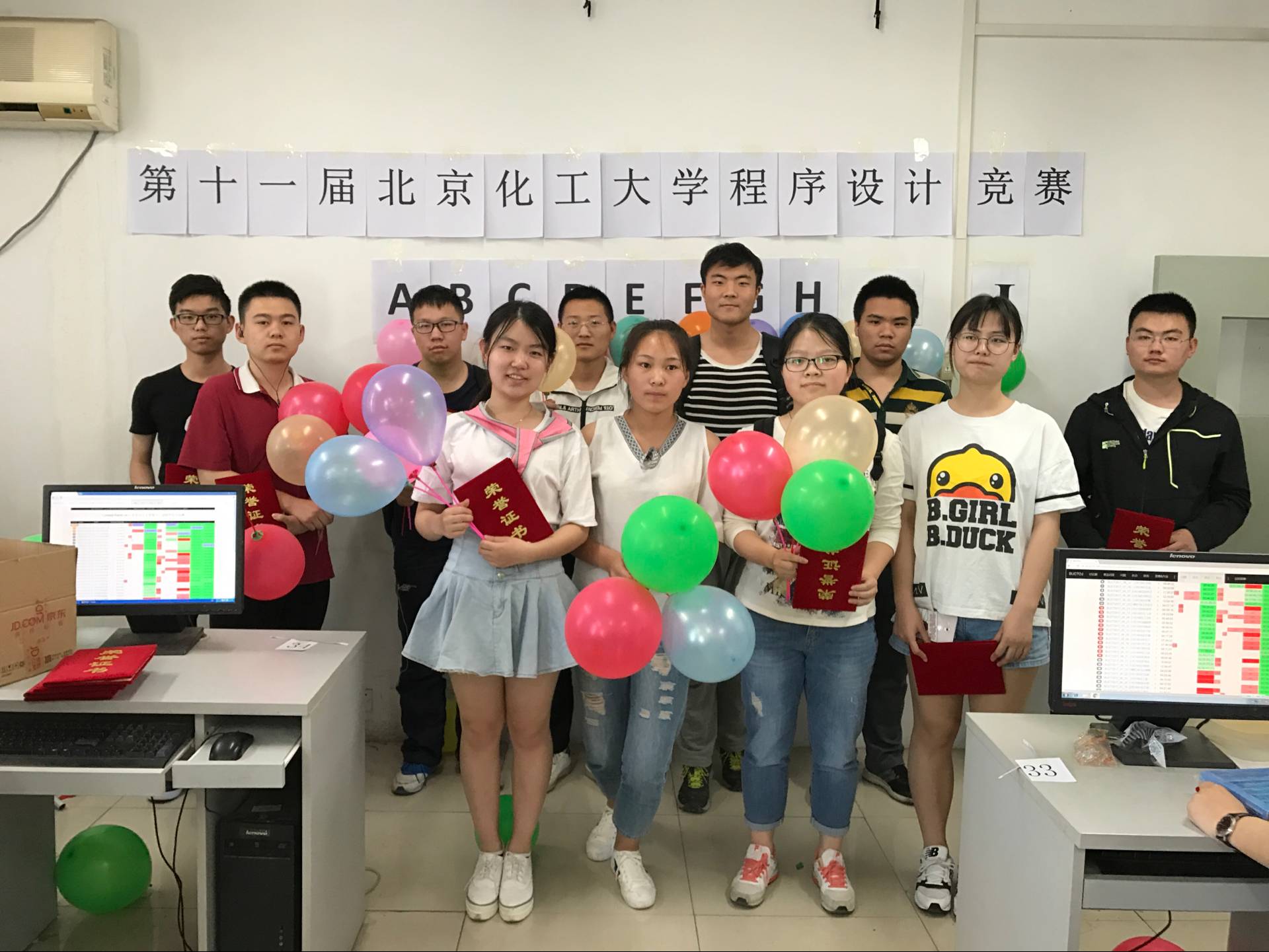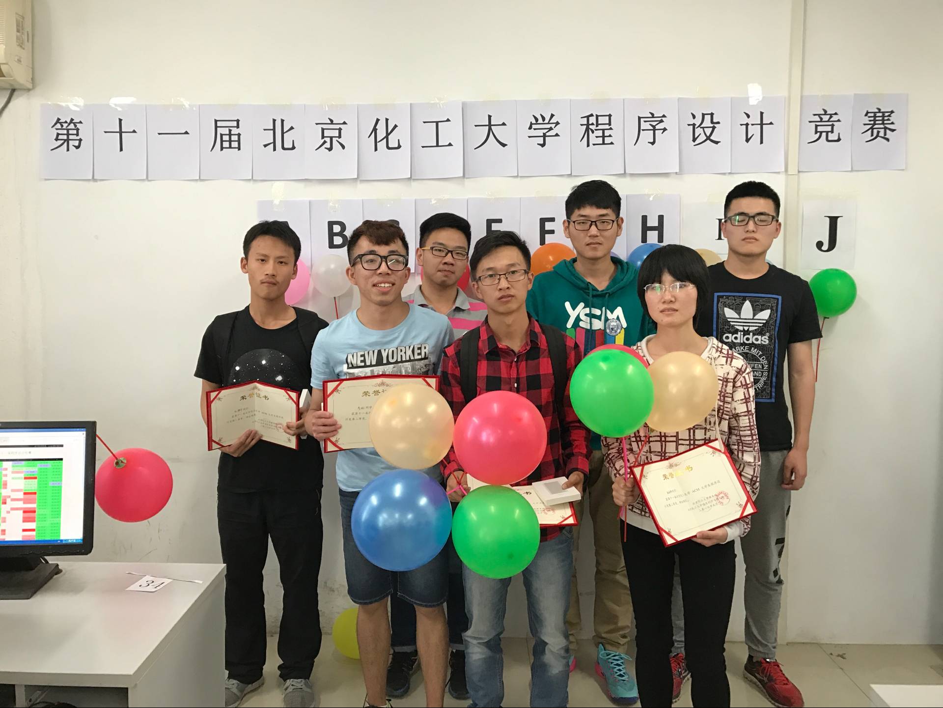 此次程序设计竞赛共设置了10道算法题,参赛选手通过在线评测系统查看题目,提交程序,每成功解出一道算法题,就有志愿者同学将题目对应颜色的气球粘在选手电脑上。