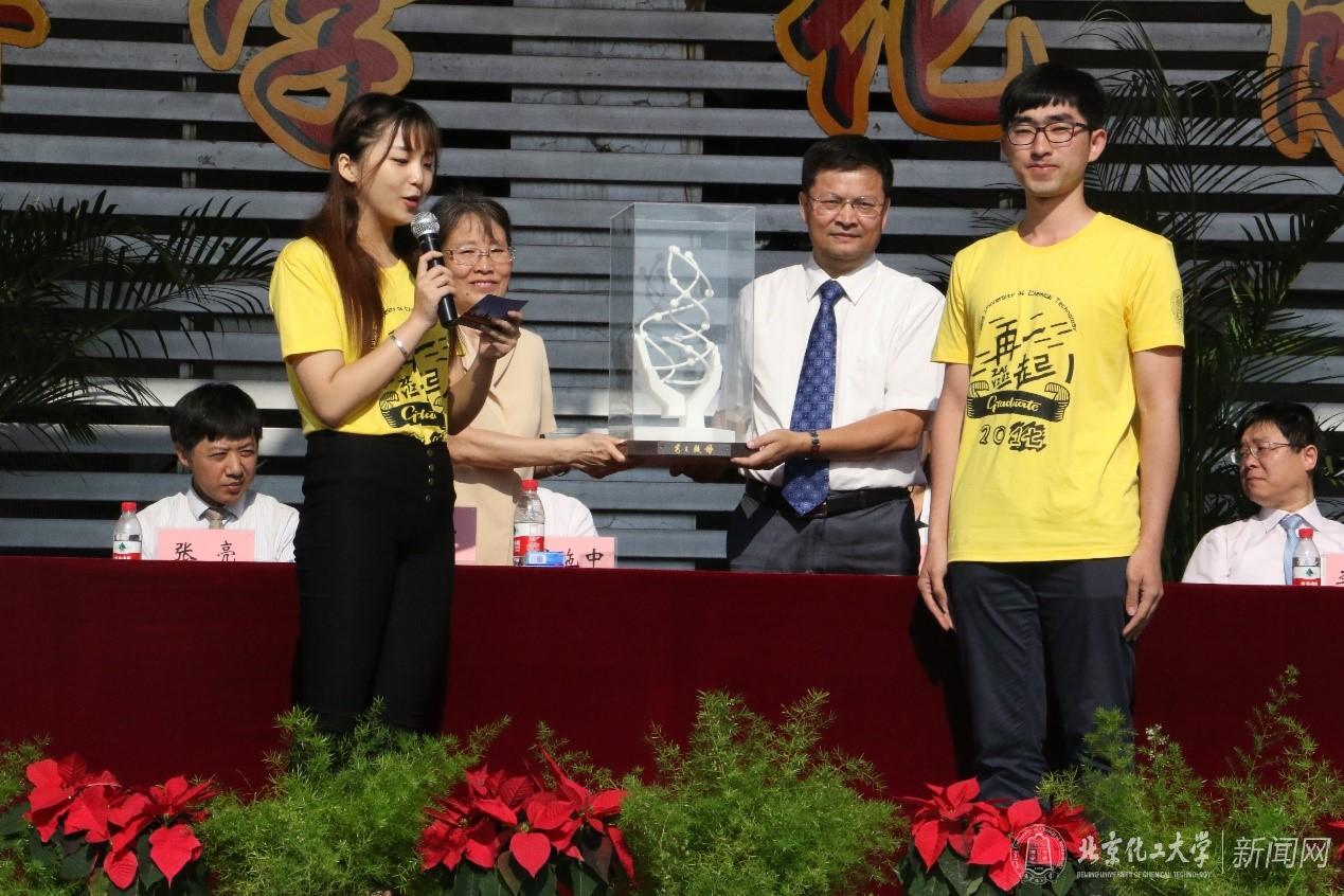 2017届毕业生代表向母校赠送了毕业礼物。由毕业生进行三维数据建模,并运用3D打印技术打印的“母校之光”模型,寄寓着2017届全体毕业生对“团结奉献、艰苦奋斗、务实力行、博学创新”化大精神的传承与发扬。王芳书记和谭天伟校长代表学校接受礼物。