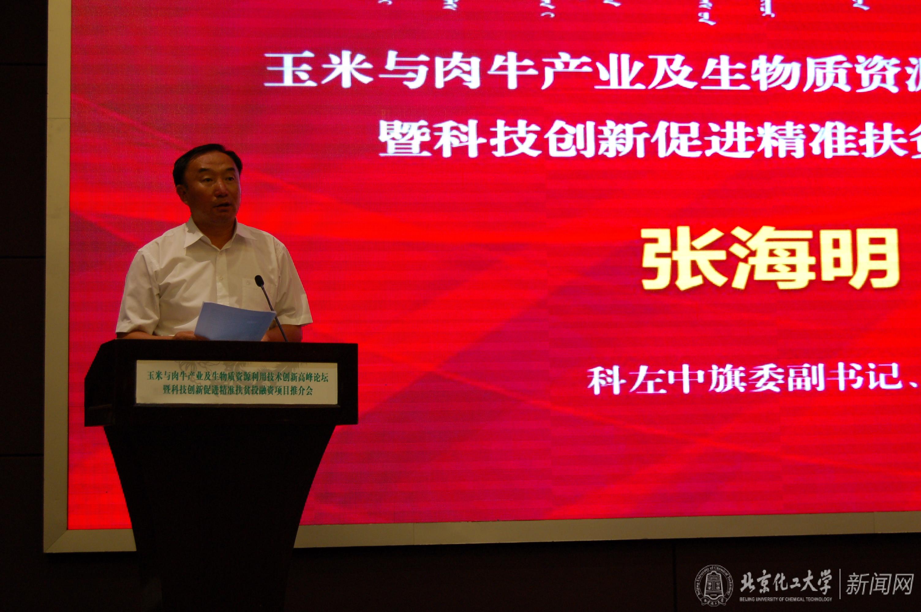 科左中旗旗长张海明代表会议东道主致辞,张海明旗长充分肯定了北京化工大学对科左中旗以及通辽市进行帮扶工作所做出的成效,重点介绍了现阶段通辽市及科左中旗在玉米与肉牛等绿色食品加工产业发展。通辽市委常委杜汇良在论坛发表讲话中指出,通辽市乃至左中旗等各区县目前正处于产业转型阶段,希望未来与各大高校进行深度的产学研合作对接,全力推进经济转型,提升产业发展层次,推动经济发展。