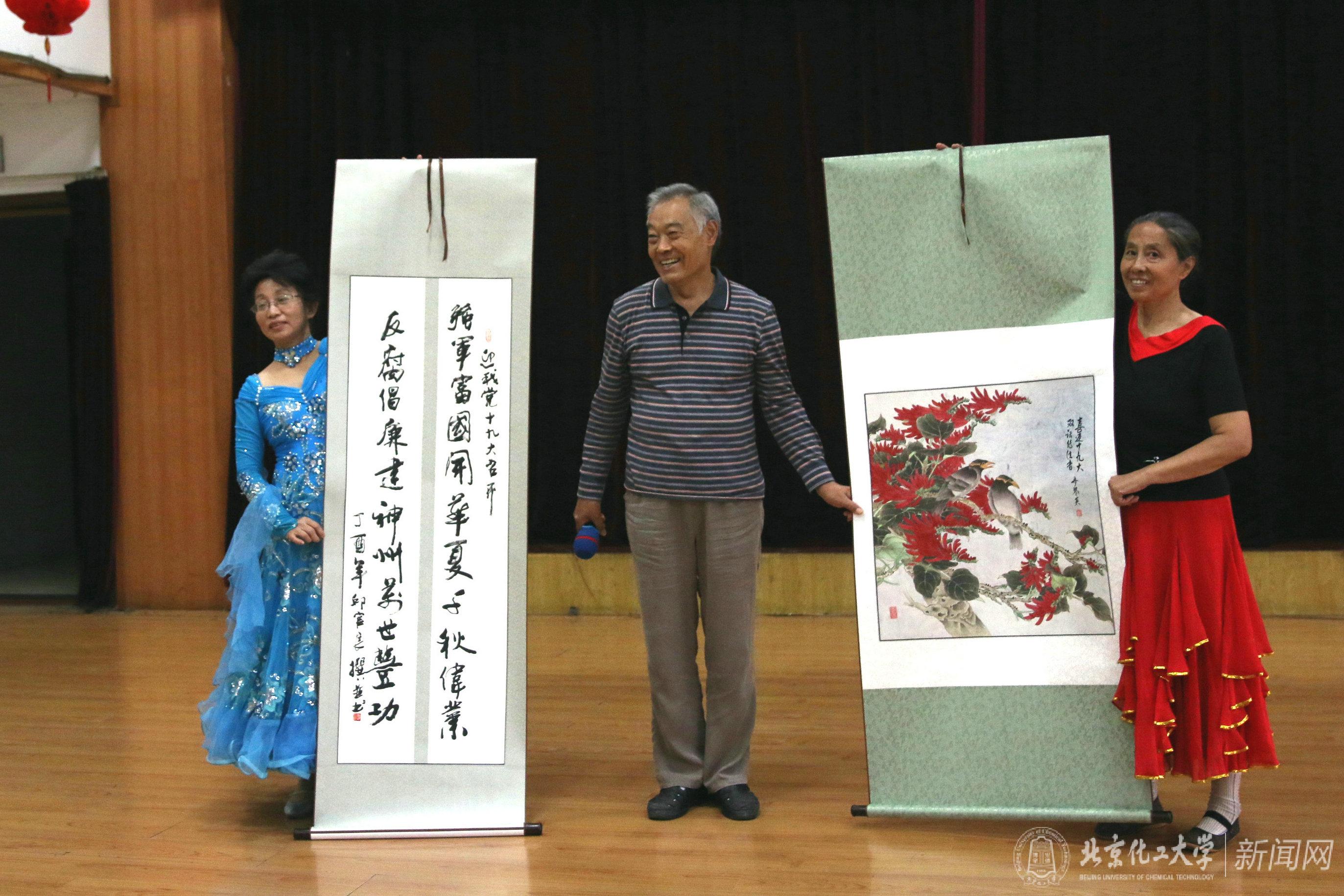文艺汇演伊始,离退休处全体工作人员献上了配乐诗朗诵《梦想照亮中国》,慷慨激昂的朗诵,表达了中华儿女追逐梦想的拼搏精神和齐心协力实现中华民族伟大复兴的坚定信念。接下来是优美抒情的合唱《十送红军》和《迎风飘扬的旗》,“合唱团”队员们用混声合唱的方式,唱出了普通老百姓对祖国、对党的一片深情。“京剧社”选送的京剧《祖国的好山河寸土不让》字正腔圆,表达了中国人民抗击日寇的坚强决心和战斗豪情。伴随着喜庆热烈的音乐,“舞蹈队”表演的民族舞《张灯结彩》将文艺演出推向**,饱满的热情,优美的舞姿,诠释了老同志祝愿国泰民安、花好月圆的情感。“书画社”将20多位老同志为了迎接党的十九大特意创作的40多幅书画作品中的2幅作品进行了现场展示。平均年龄80多岁的“合唱队”老同志们也献唱了《夕阳红》和《我爱你中国》,赢得了在场老同志的阵阵喝彩和热情掌声。最后,“交谊舞协会”表演了交谊舞《中国歌最美》,动感的节奏,欢快的舞步,将老同志对祖国的赞美和热爱表现得酣畅淋漓。文艺演出结束后,意犹未尽的老同志们纷纷登台,随着音乐载歌载舞。
