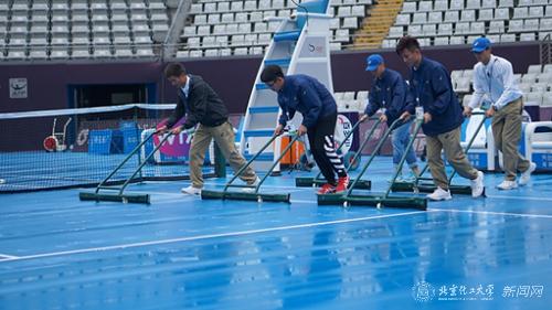 中网赛事期间,我校学生发挥出踏实肯干、积极工作的态度,为赛事有序的进行提供了保障,赛场服务岗位的一项重要职责就是场地干燥处理,要求场地要在30分钟内达到80%干燥程度。10月2日因天气原因连绵多雨,刚处理完一次场地又开始下雨,一天干燥场地的次数达到了中网的历史纪录,推了五次水,干了五次场地。同学们一次又一次的突破极限,最快纪录为18分钟。这不仅是速度的提升,更是我校学生认真工作态度的体现,也一度获得ATP/WTA赛事国际裁判长以及国际赛事监督的肯定及鼓励。