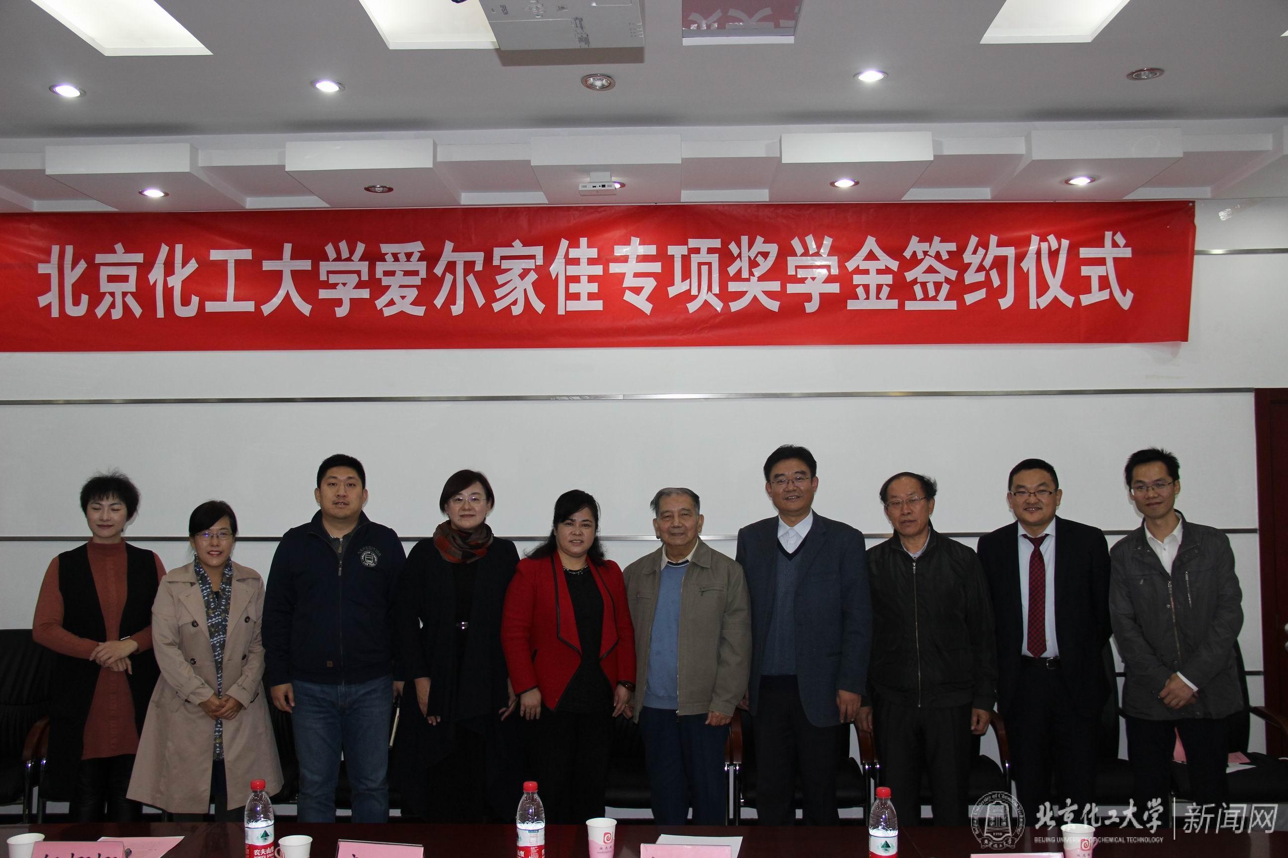 校党委副书记宋来新与青岛爱尔家佳新材料股份有限公司郭焱共同签署奖学金协议,青岛爱尔家佳新材料股份有限公司捐赠10.5万元用于设立“北京化工大学爱尔家佳专项奖学金”。