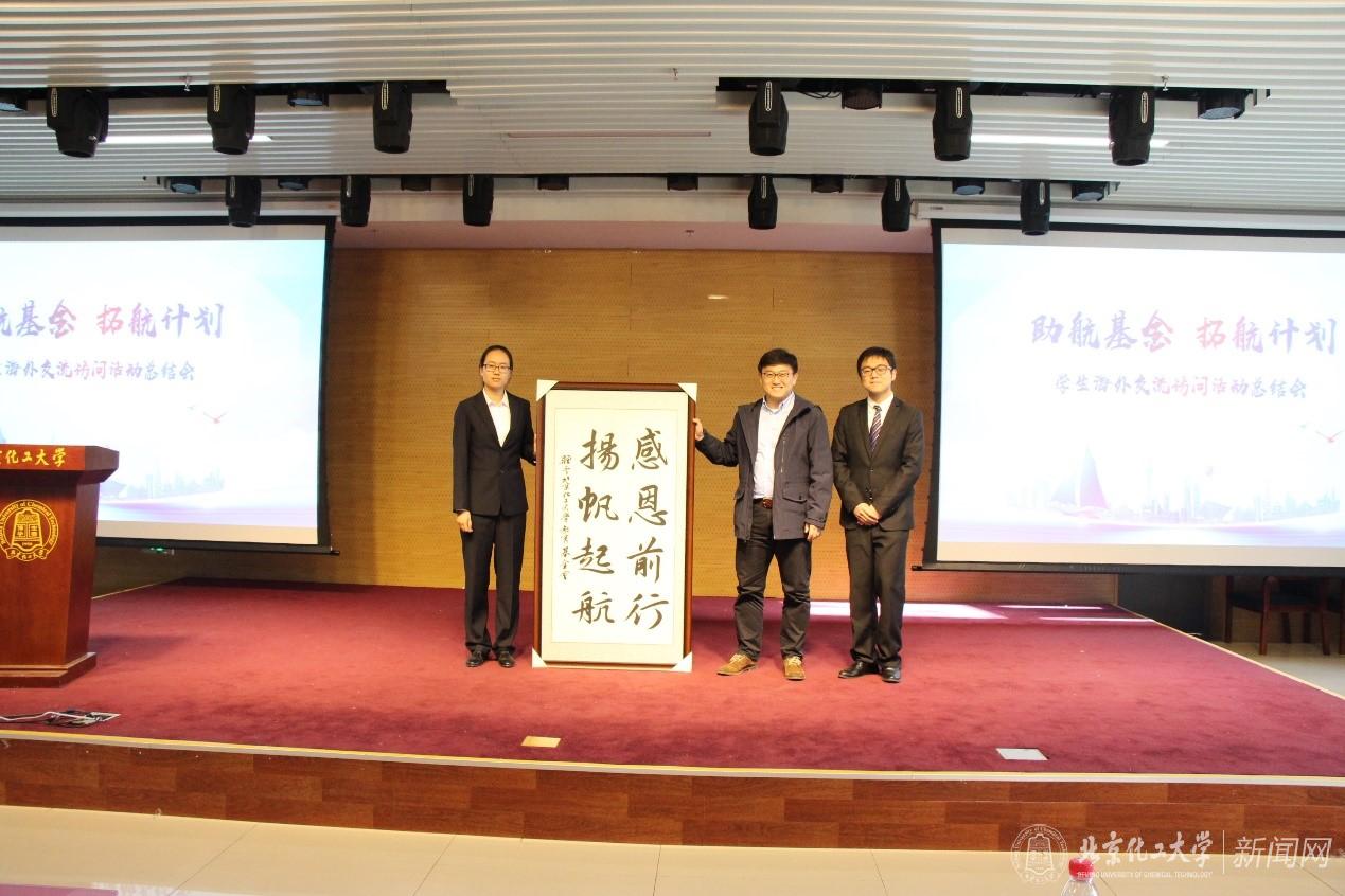 国际交流与合作处副处长王永生为第三期“拓航计划”学员颁发结业证书。“拓航计划”项目学员代表将写有“扬帆起航 感恩前行”的书法作品赠与学校,在表达谢意的同时希望能为之后拓展的学习交流项目贡献自己的力量。