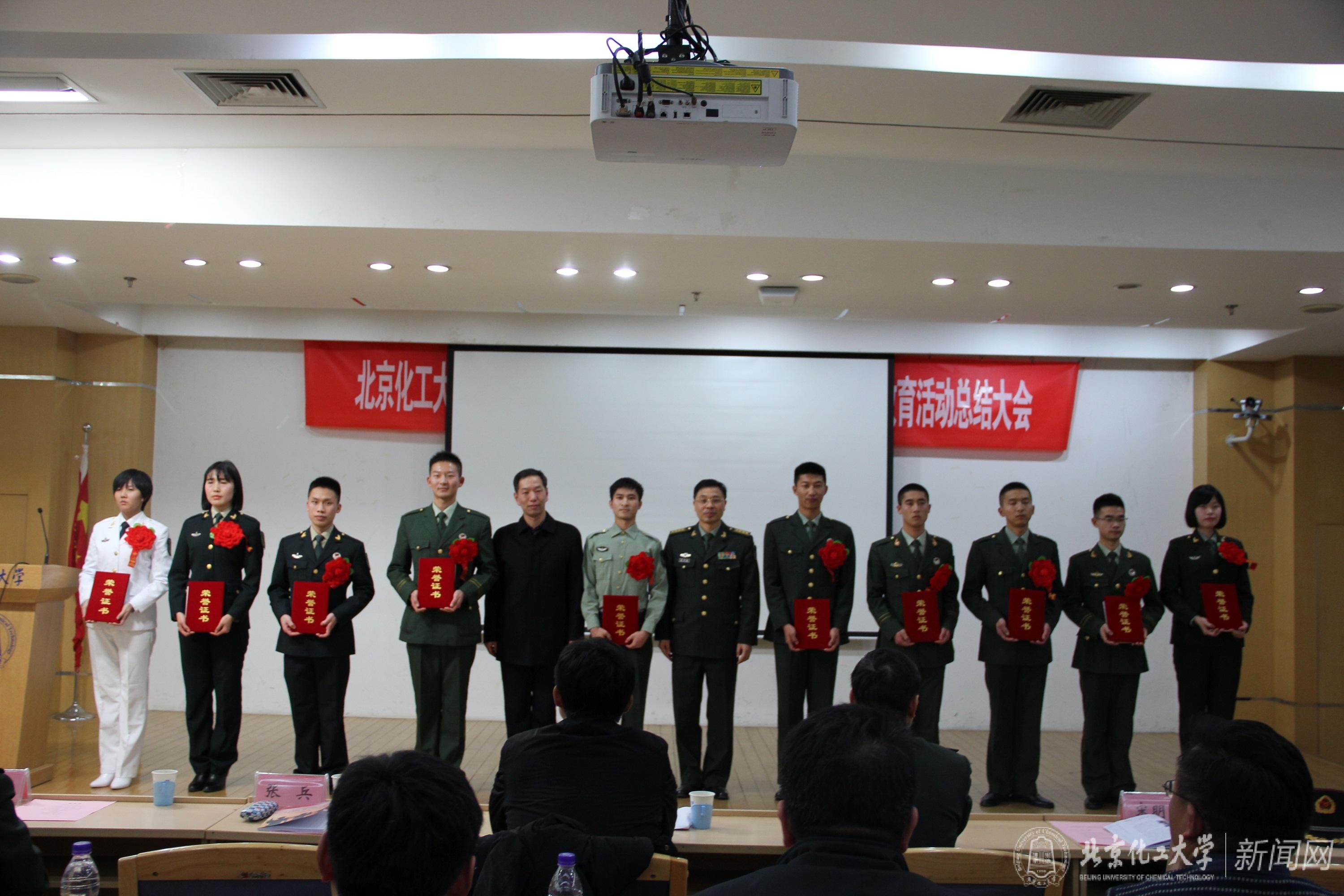 11月17日下午,我校在会议中心多功能厅举行了2017年退伍大学生士兵表彰大会暨“国防教育季”主题活动总结大会。校党委副书记宋来新,东城区区委常委、武装部政委徐文熬大校,北京市教委体卫艺处正处级调研员张兵,《***报》社技术运营部主任宋明亮大校,北京市征兵办公室征集组组长、北京卫戍区司令部动员处副处长田俊杰中校,北京高校国防教育协会研究室主任张庆春,校学生工作办公室主任商云龙老师,教务处副处长张凤元老师,武装部部长丛迪,各学院学生工作负责人,征兵工作负责人,2017年退伍大学生士兵,往年退伍老兵,以及国旗护卫队队员、退伍大学生旌旗中队、“绿野仙踪”军事定向越野协会的同学们参加了大会。