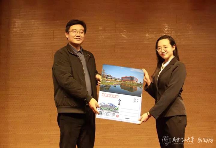 为了体现我校的文化内涵,增进高中学子对我校的了解,今年我们特意为同学们准备了“祝福高中母校”纪念品,校党委副书记宋来新为学生代表颁发纪念品样本。