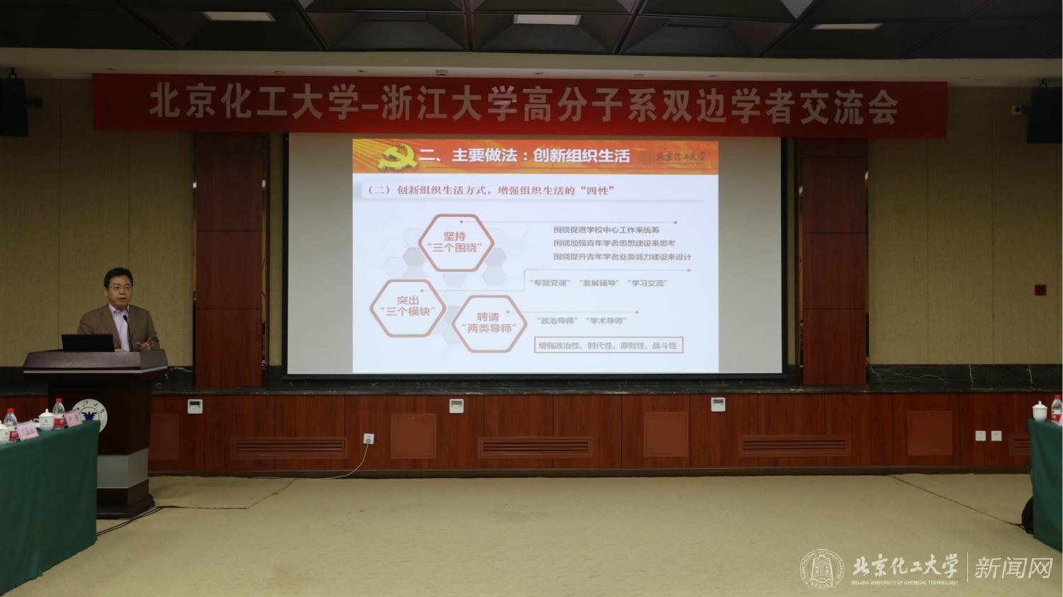 甘志华副书记以“‘红色引擎’引领青年学者又红又专发展”为题,从工作思路、主要做法和主要成效三个方面介绍了我校“红色引擎”工程。浙江大学高分子系楼仁功书记就高分子系党建和人才工作的具体做法进行了介绍。