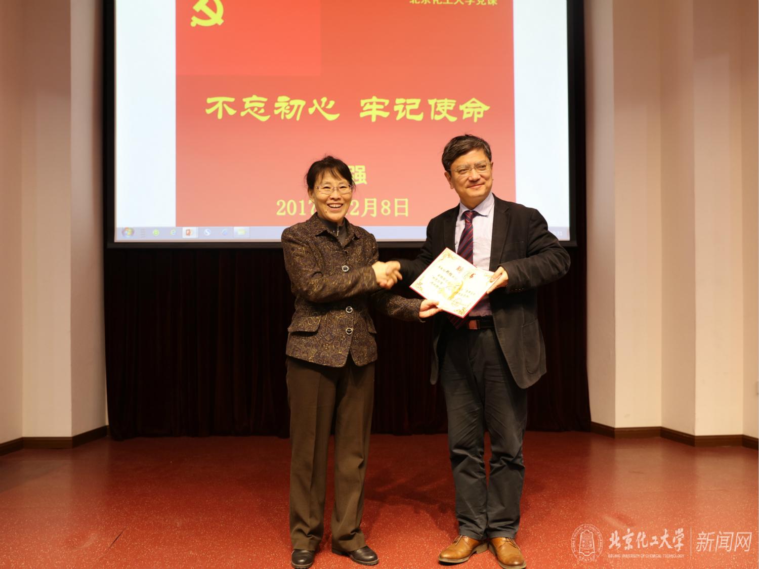 郑强副书记为我校“红色引擎”党支部青年学者和浙**生讲授题为“不忘初心、牢记使命”的专题党课。王芳书记为郑强副书记颁发北京化工大学青年学者“红色引擎工程” 的“政治导师”聘书。