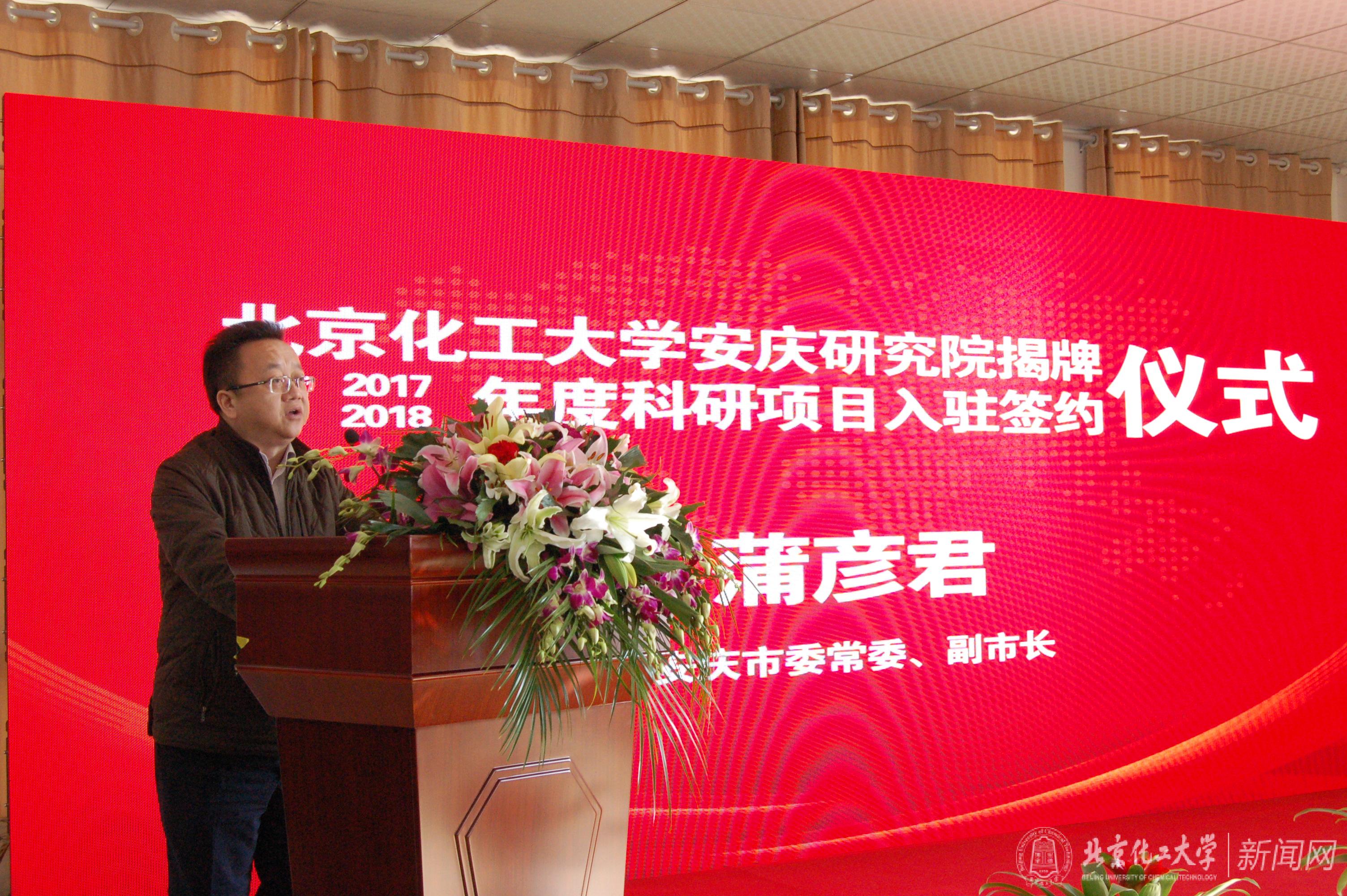 安庆市委常委、副市长蒲彦君代表安庆市委市政府致辞,强调北京化工大学安庆研究院是安庆市真正意义上的、第一个正式落地的产学研共享平台,是安庆市实施创新驱动发展战略的重要举措,将对安庆市加快创新发展、构建新产业体系起到巨大的推动作用,标志着安庆创新强市建设开启新篇章,希望北京化工大学安庆研究院充分利用自身优势,发挥产学研平台的核心作用,加强自身建设,完善运营机制,实现前瞻性基础研究、引领性原创成果上的重大突破,为地方经济发展多做贡献。