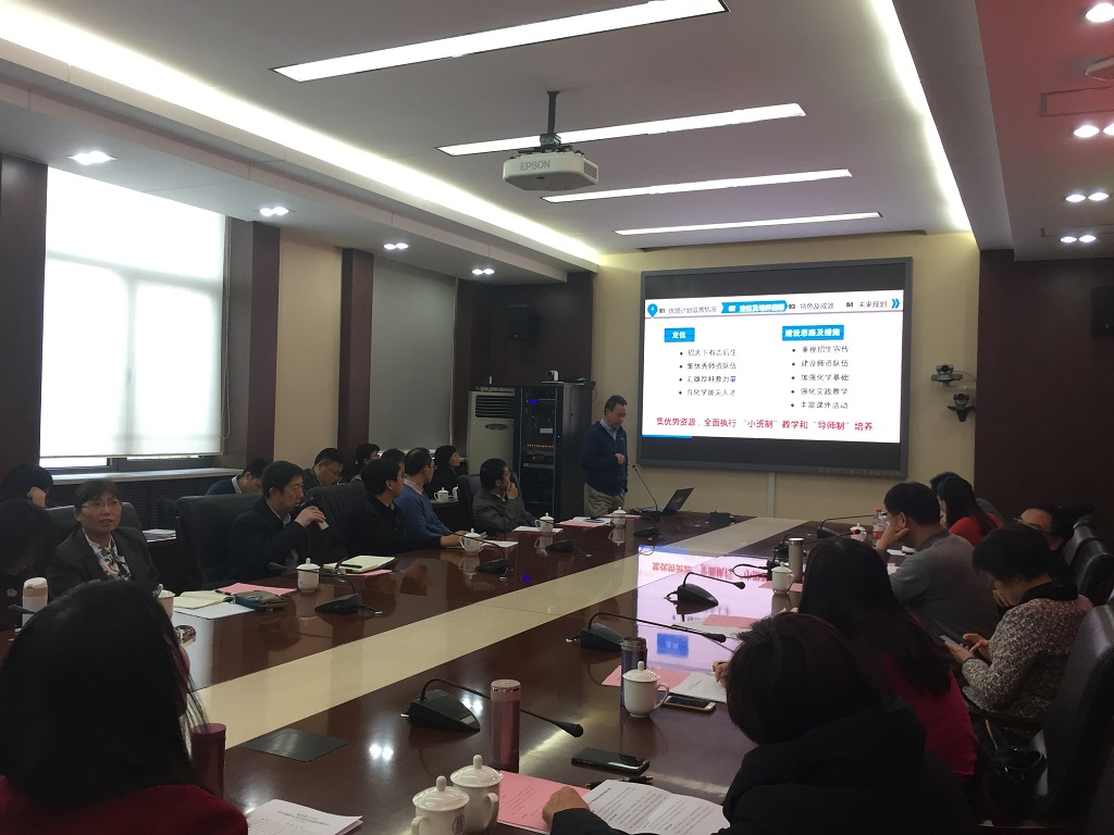 谭天伟校长听取汇报与讨论后讲话。各学院一定要高度重视拔尖创新人才培养工作,这既是我们招生工作中一张重要的名片,也是育人改革的重要措施;要进一步明确培养目标,认真思考如何将一流师资、一流管理、一流课程等教学资源用于拔尖创新人才培养过程中去,保证人才培养质量;课程体系和课程模式应突出科教融合,大力推行project课程、研讨式课程、以问题为导向课程等,强调对学生创新能力的培养;要不断开拓学生的国际视野,促进国际交流与合作,鼓励学生参加国内外高端学术会议;要出台一系列配套措施,解决学生免试攻读研究生政策、教师工作量计算方法等具体问题,为实验班的持续发展提供政策保障。