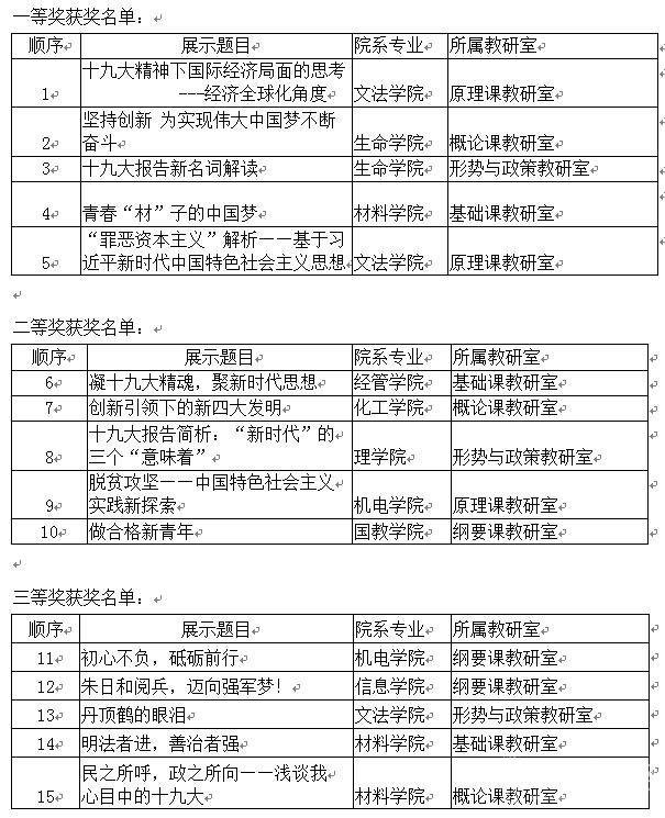 经过激烈角逐,此次展示活动评选出五个一等奖、五个二等奖和五个三等奖。学校教学督导专家马长英教授对讲思政课的各学生团队进行了精彩点评。马长英教授见证了我校思想政治理论课教学团队的不断壮大、教学质量的不断提升,她对本次活动给予了高度评价,认为这是马克思主义学院学习和宣传十九大精神和习近平新时代中国特色社会主义思想的重要举措,也是思政课教育教学改革成果的重要体现。