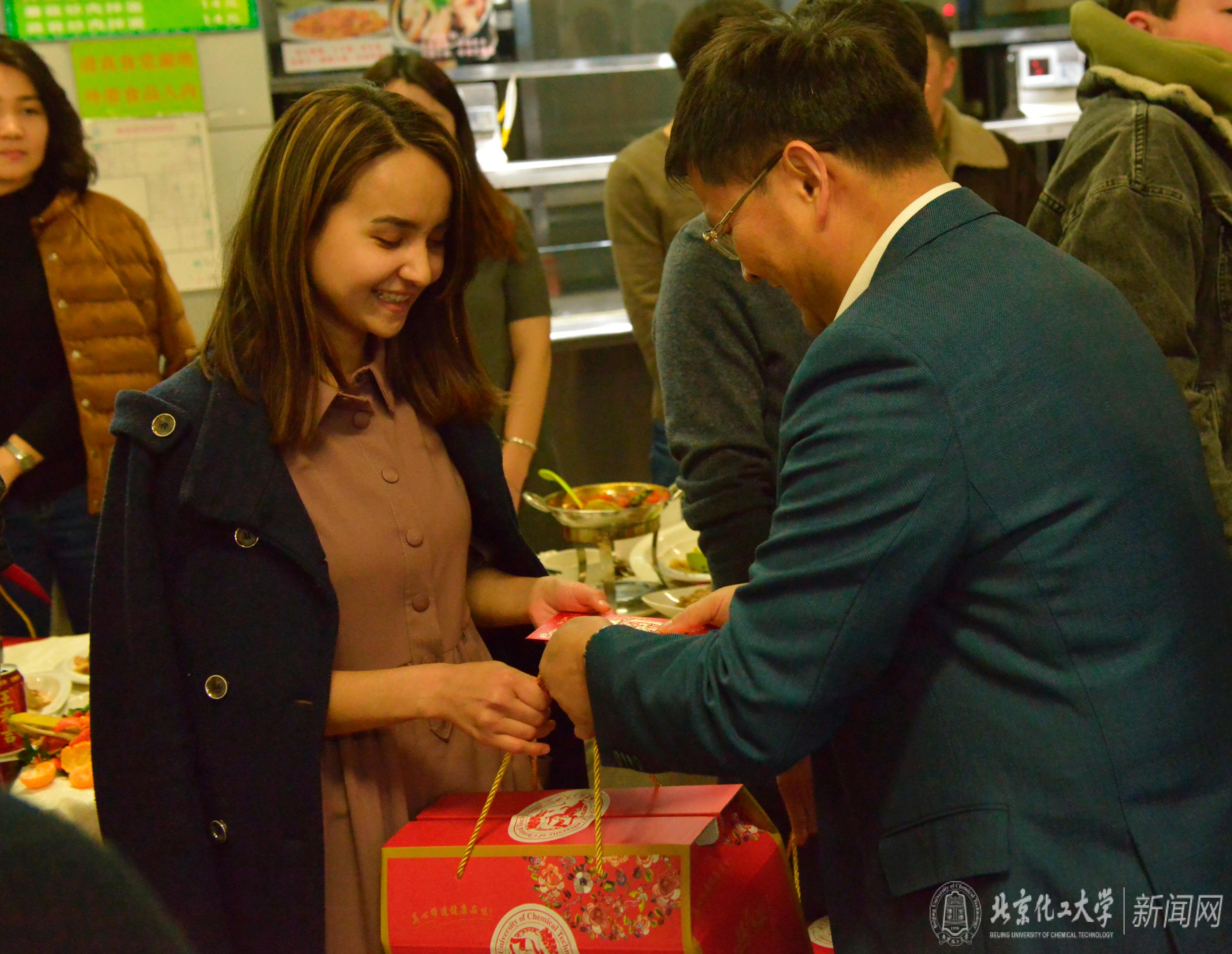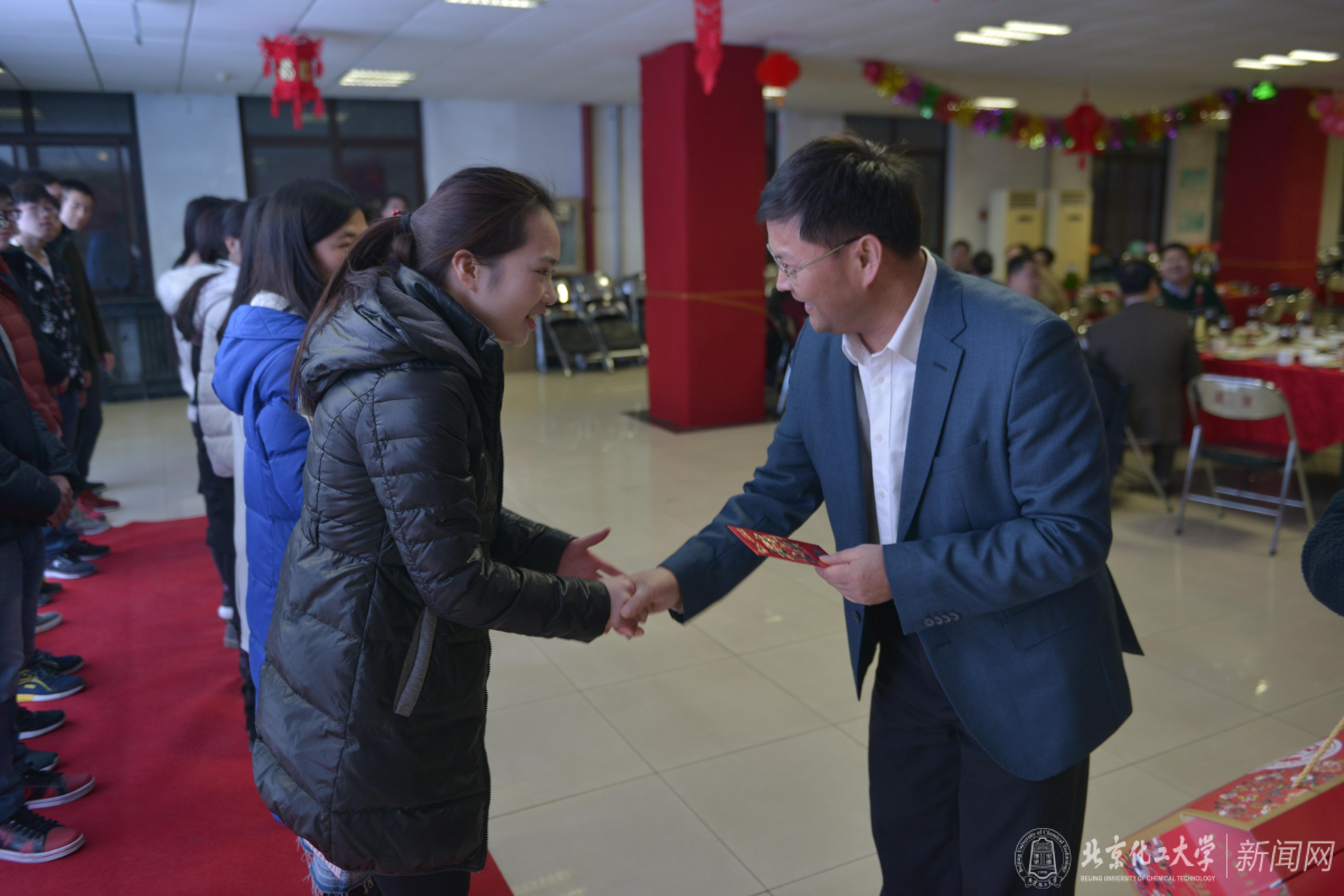 除夕夜,校领导一行来到就业中心和**餐厅与寒假留校过春节的学生共进年夜饭,欢度除夕。党委办公室、校长办公室、学生工作办公室、研究生院、保卫处、后勤集团和各学院负责人一同与留校学生共度除夕。学生工作办公室和后勤集团为留校学生准备了丰盛的年夜饭。王芳书记代表学校向留校过年学生及其家人致以亲切问候和最美好的新春祝福,勉励大家在新时代要有新作为。谭天伟校长代表学校向留校学生发放了满载学校关怀的“红包”和“新春礼包”,并向所有在校同学送上祝福。理学院赵广益同学代表所有留校学生表达了对学校领导与老师的感谢和对家人的思念与祝福。随后,在场所有领导、老师和同学们共同举杯迎接新年的到来。