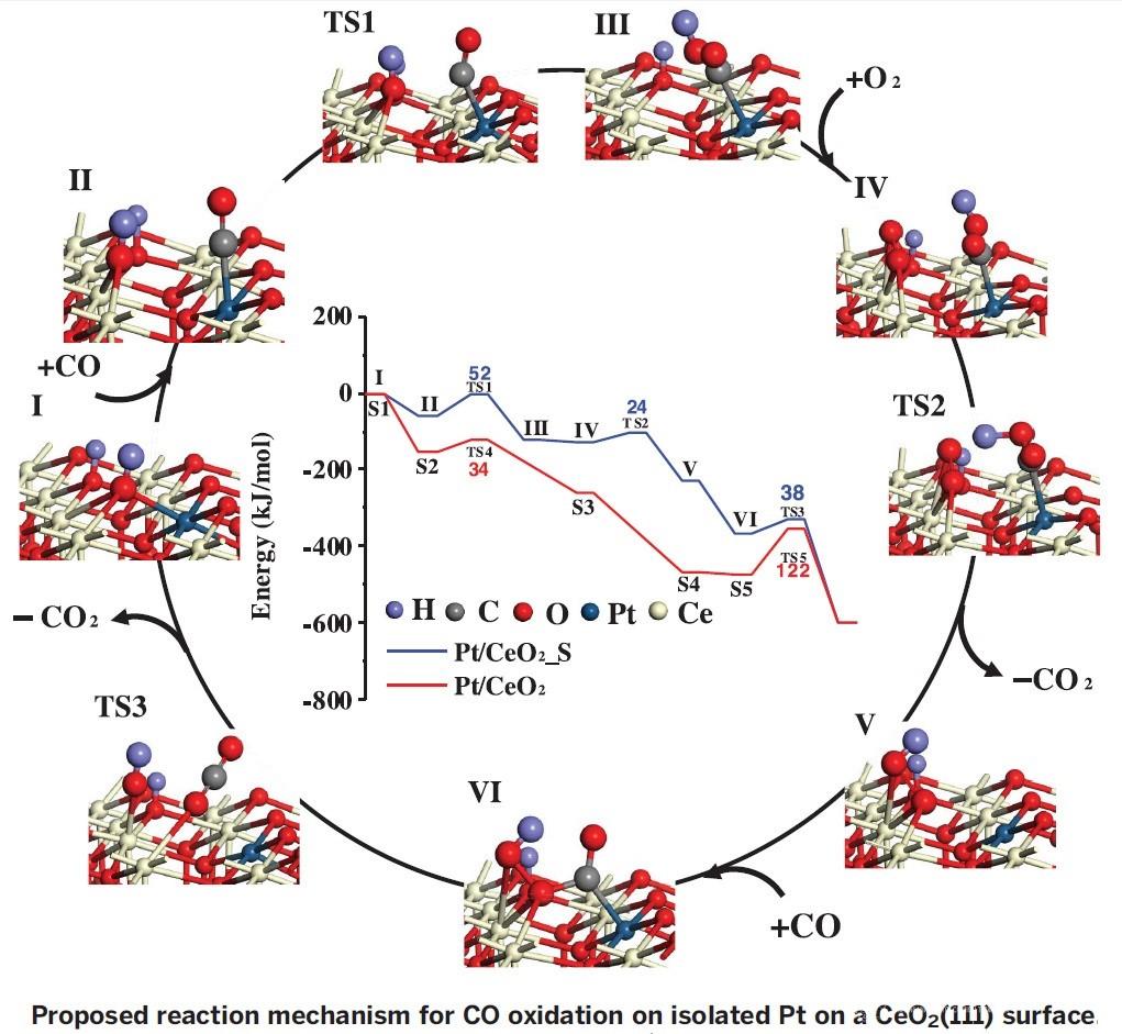 2016年-2017年间,由北京化工大学推荐,在国家留学基金委资助下,任志博同学前往美国西北太平洋国家实验室进行联合培养;联合培养期间,基于在北京化工大学取得的实验研究成果对Science论文中报道的单原子Pt/CeO2催化剂研究提出了许多建议,并在国外联合培养导师梅东海教授指导下独立完成了论文中全部的理论计算工作。基于其在论文完成过程中的贡献,任志博被列为该文的第五作者,合作导师梅东海教授被列为共同第一作者。这是我校博士研究生作为共同作者, 北京化工大学作为署名单位, 首次在国际顶级综合性期刊Science上发表的研究论文。论文中任志博同学创新工作图示如下,Pt/CeO2催化剂上水分子的引入能够显著活化表面晶格氧,诱发CO氧化反应路径的改变,使催化循环过程中基元反应最高能垒由122 kJ/mol降低至52 kJ/mol,理论计算良好释疑了Pt/CeO2催化剂具有优越CO低温氧化活性的原因。据此研究结果,提出了通过高温水蒸气处理改善单原子Pt/CeO2催化剂性能的新方法,预测了此类催化剂在汽车尾气处理中的广阔应用前景。