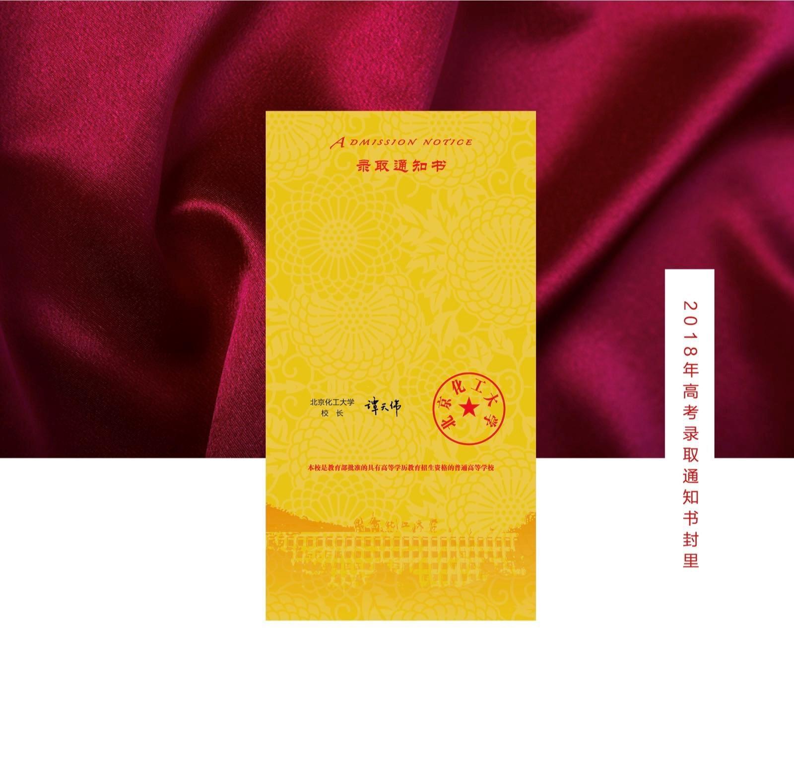 北京化工大学2018年高考招生录取通知书采用单页横版加长设计。分封面和封里设计。主要设计元素包括颜色、图案和文字。