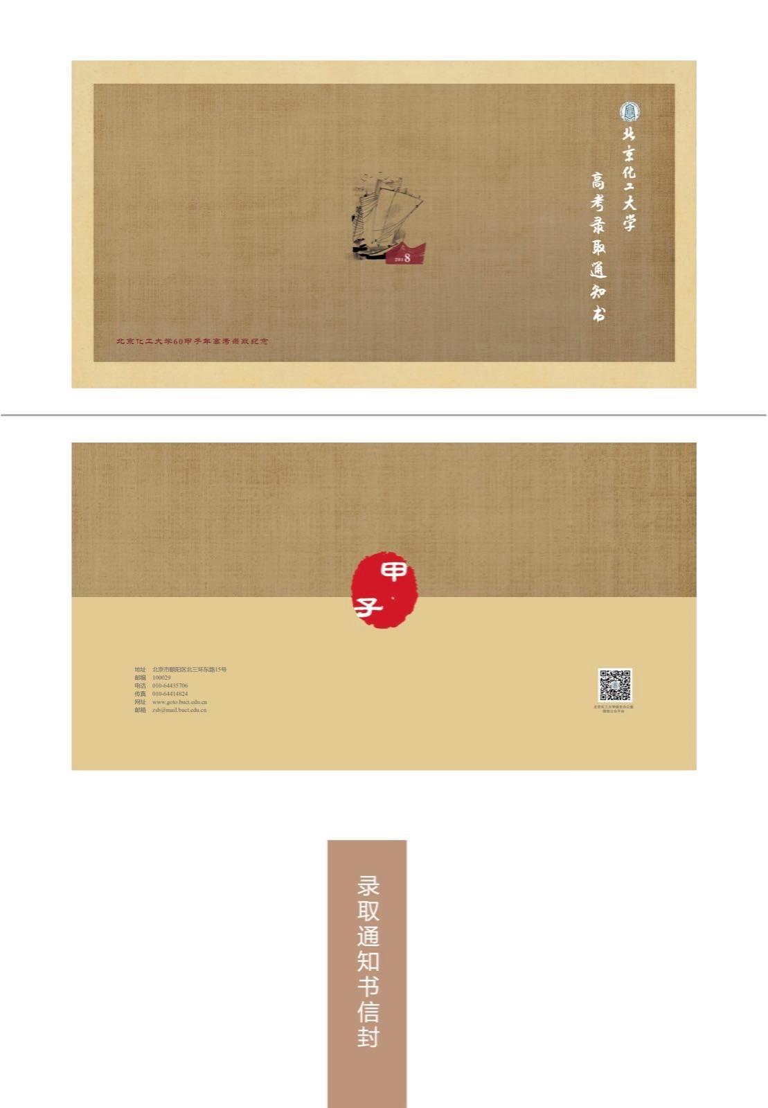 北京化工大学的高考招生录取文化形象设计,以高考录取通知书为核心,形成一个既具备高考招生录取功能又具有学校文化传播意义的文化设计体系。内容包括:高考录取通知书、高考录取信封、高考录取指归。2018年是北京化工大学建校60周年的甲子年,为突出学校60甲子诞辰意义,此次招生录取文化形象设计,从多个角度和层面,增添了60甲子年的庆贺与纪念元素。此外,2018版设计,秉持学校博学创新、赞天地之化育的办学育人精神,以天地自然为本,取材山川自然,寄寓象征意义,反映学校办学与因循宇宙自然客观真理的“天人合一”性。