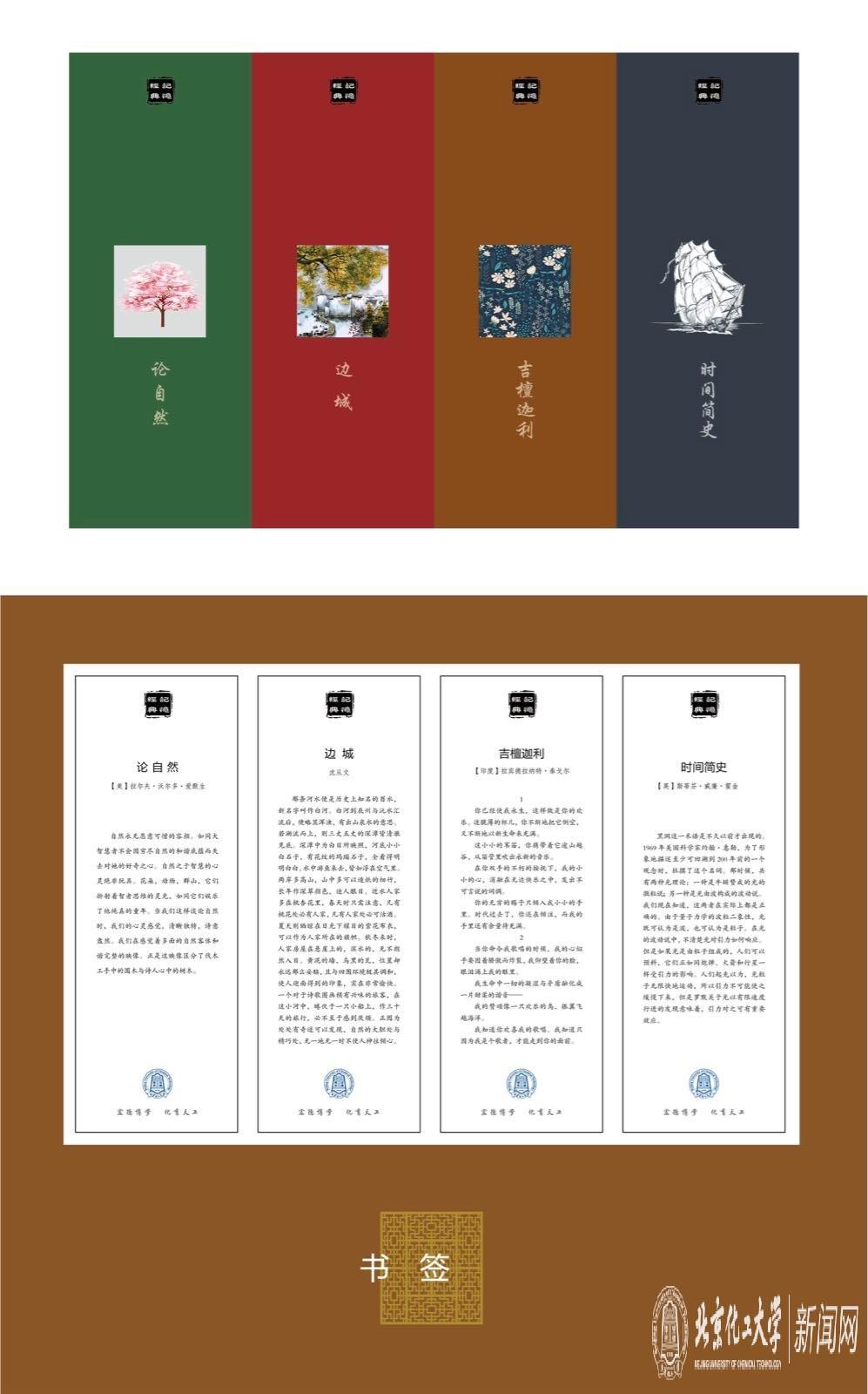 “高考录取留念”包括两部分内容设计。其一,留念书签。2018版留念书签由分别推介四部经典名著的书签组成。推介四部名著为:《论自然》(爱默生)、《边城》(沈从文)、《吉檀迦利》(泰戈尔)、《时间简史》(霍金)。其二,留念明信片。2018版留念明信片由代表学校两个校区的校景图明信片组成。第一张选用东校区主教楼,以金黄色为底色,象征对北京化工大学60甲子年诞辰的纪念。第二张选用北校区主教楼,主教楼圆形设计,大气时尚,与蓝天白云相应,突显学校博学创新、赞天地之化育的办学气象。