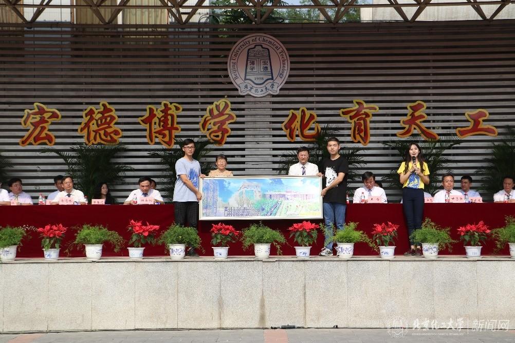 2018届毕业生代表向母校赠送了毕业礼物。由2018届毕业生对我校老北区、西校区、东校区和昌平校区四个校区的主教楼进行全景手绘,并运用立体光栅化技术制作出全息效果成品,寓意四年时光荏苒,我们逐梦同心;青春岁月如梭,我们一路同行,寄寓着2018届全体毕业生对甲子华诞之际母校最为真挚的祝福。王芳书记和谭天伟校长代表学校接受礼物。