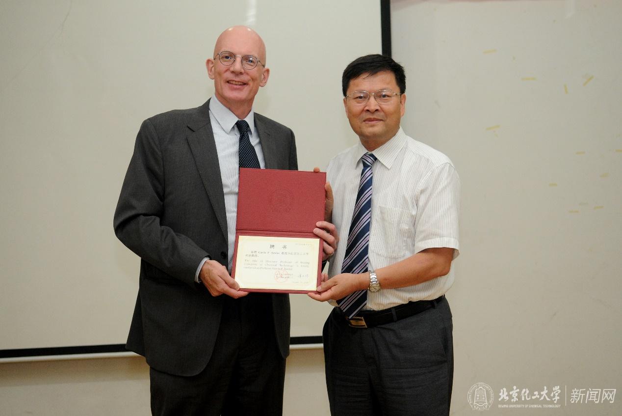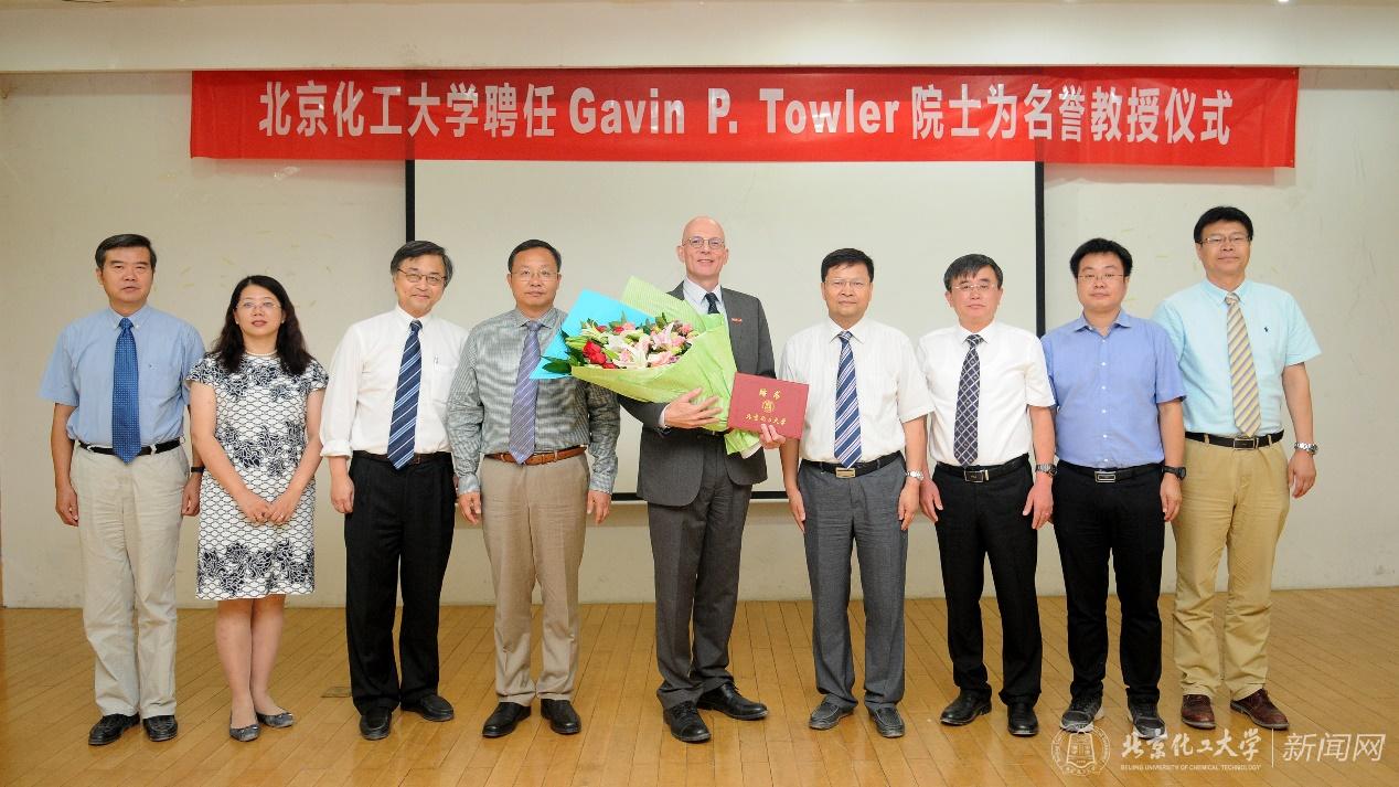 化学工程学院院长邱介山教授介绍了Towler院士的履历及所取得的成绩。谭天伟校长为Towler院士颁发了名誉教授聘书,学生代表为Towler院士献花并佩戴校徽。