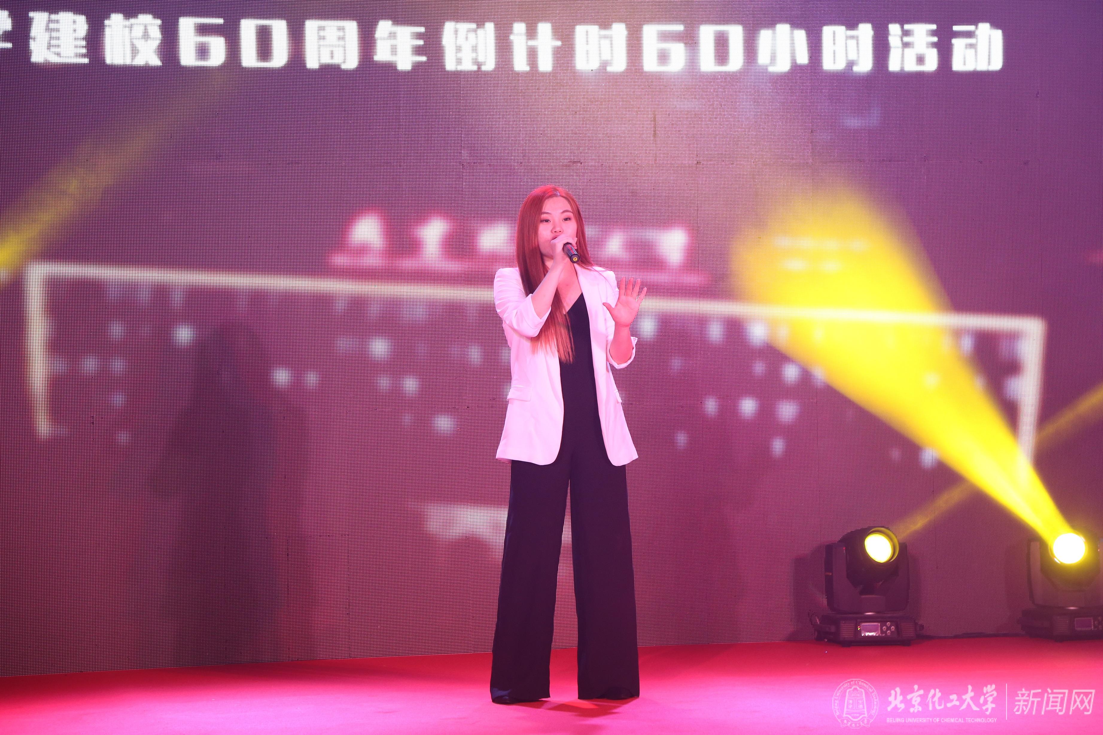 2018届毕业生王近苏、2017届毕业生杨帆等同学现场相继献唱了《无问》、《当你老了》等歌曲。活动现场连线了远在千里之外的上海分会场,在北京、上海两地师生及校友的共同期待和注目下,上海浦东陆家嘴金融贸易区的标志性建筑之一花旗银行大厦屏幕上显示出了学校建校60周年主题LOGO及主题“甲子薪传 筑梦百年”、北京化工大学60岁生日快乐、我爱北化等字样。在现场振奋人心的倒计时声中,学校六号学生公寓楼灯光秀在距离校庆日60小时之时正式开始,并相继闪现“化大”、“甲子”、心形及心形内嵌60字样,与上海分会场点亮活动遥相呼应,将活动气氛推向**,赢得现场师生的声声欢呼与阵阵掌声。杨帆同学返场倾情演绎歌曲《夜空中最亮的星》,以星光喻祝福,表达对母校的热爱和祝愿。