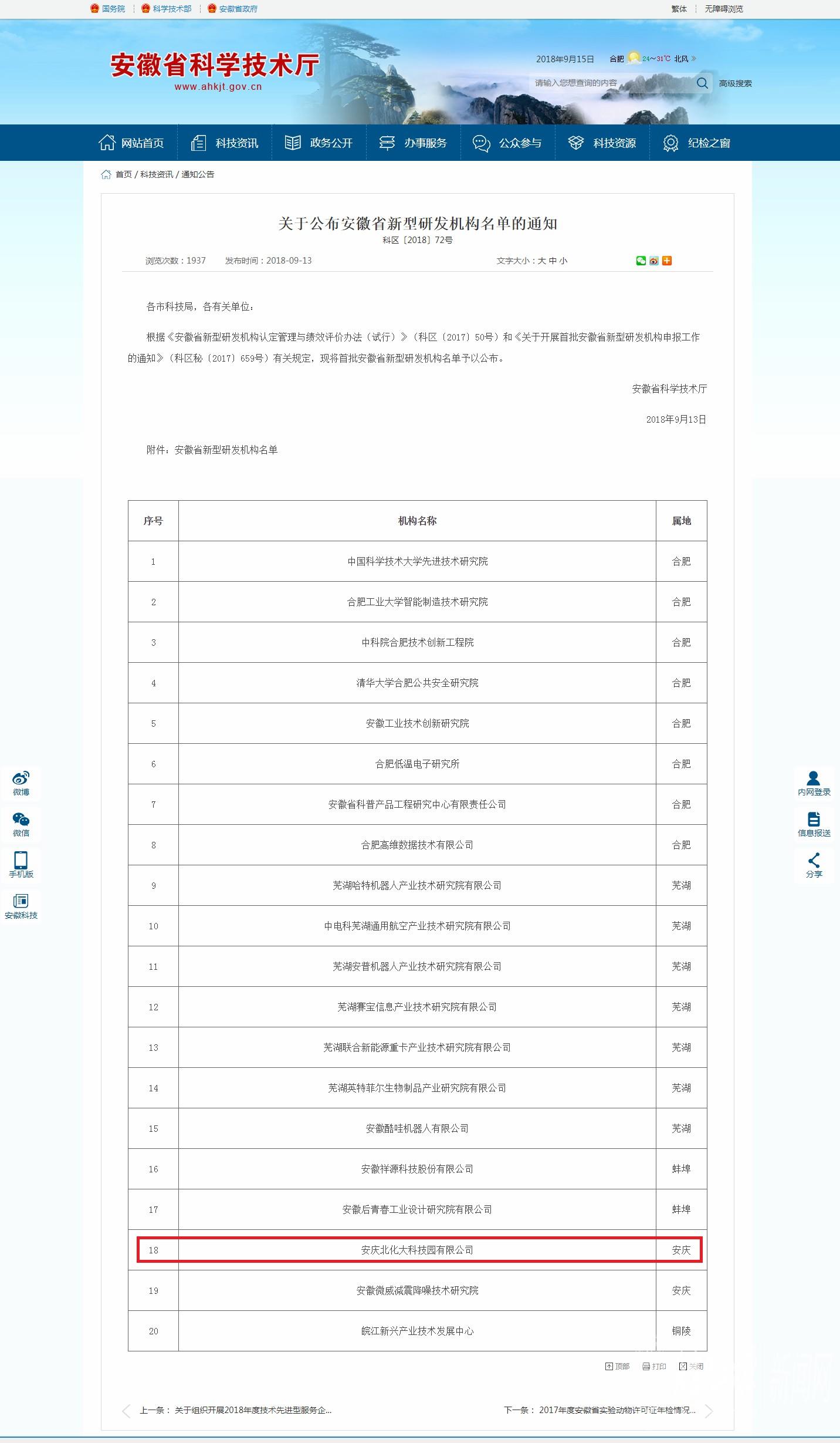 9月13日,时值我校喜庆60周年之际,从安徽省科学技术厅下达的《关于公布安徽省新型研发机构名单的通知》科区[2018]72号文件中获悉,安庆北化大科技园有限公司、中国科学技术大学先进技术研究院、合肥工业大学智能制造技术研究院、中科院合肥技术创新工程院、清华大学合肥公共安全研究院在内的20家科研机构荣获安徽省新型研发机构荣誉称号。