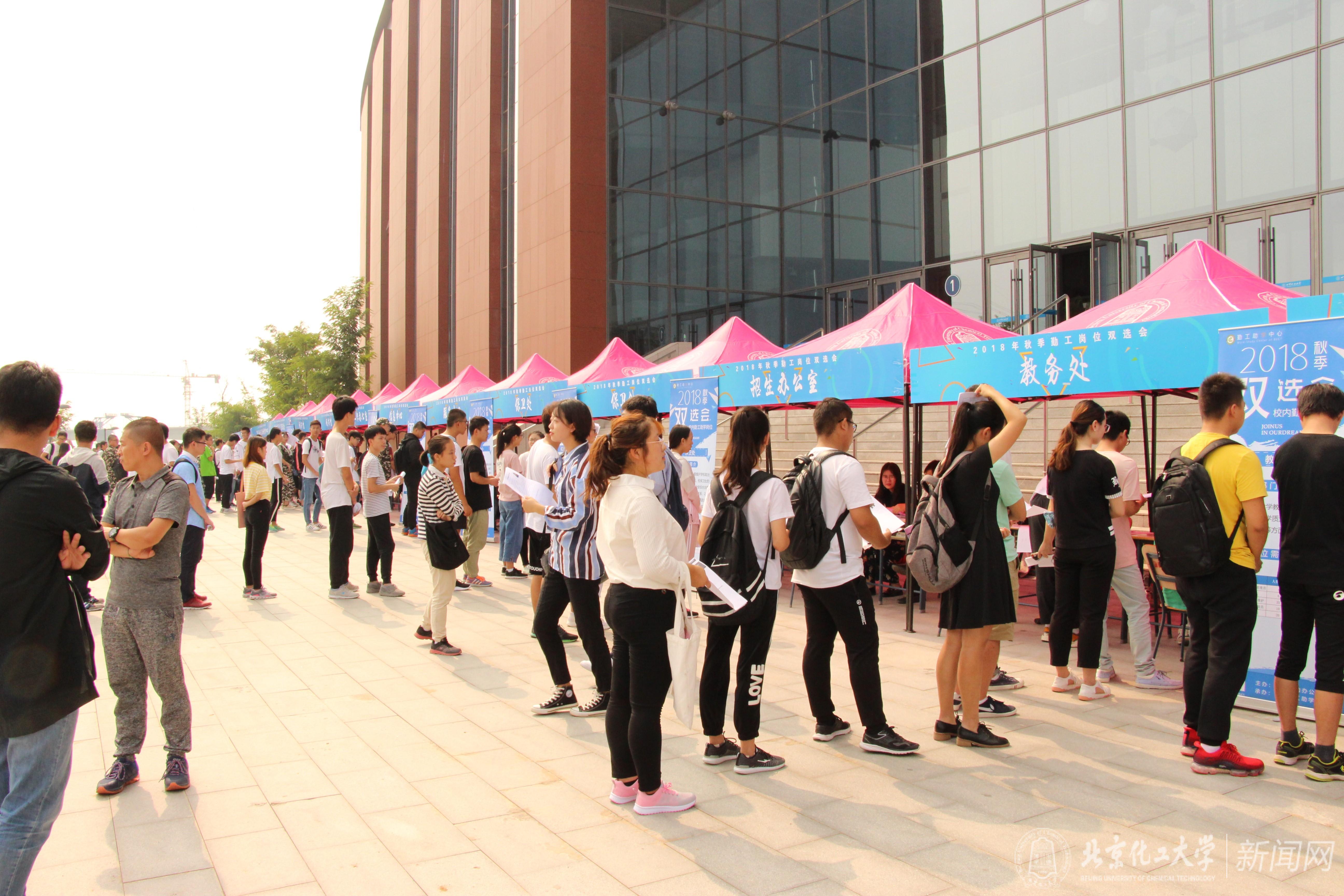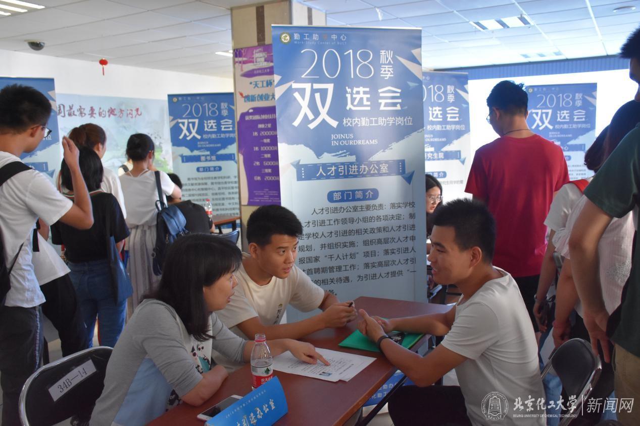 9月12日、13日,“北京化工大学-2018年秋季勤工助学岗位招聘双选会”分别在昌平校区体育馆正门广场和东校区就业中心大厅举行,校党委副书记宋来新亲临现场指导。本次双选会涉及学校25个机关部门、11个学院,共提供校内勤工助学岗位2088个,涵盖了教学辅助、科研助理、行政管理助理、公共服务延伸、校园监督等各种类型,吸引了3000余名学生现场应聘。