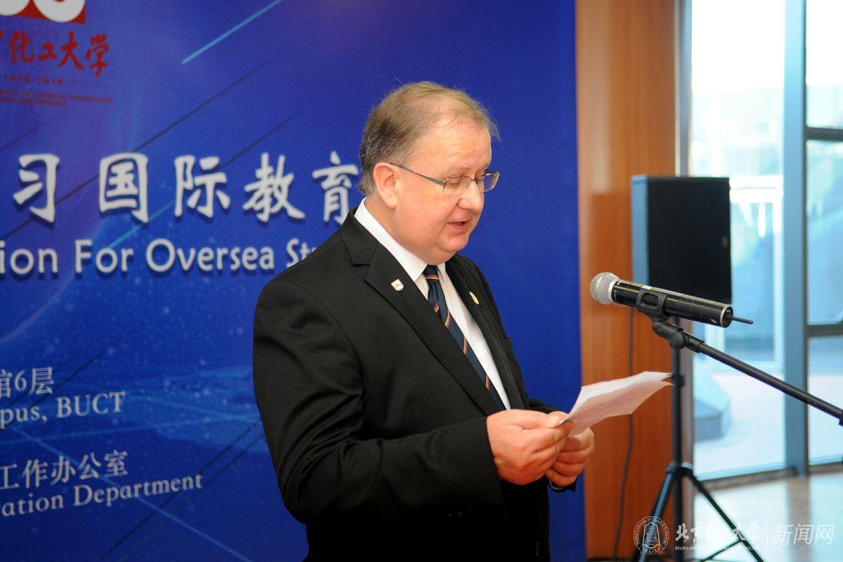 开幕式上,英国伯明翰大学教授Dr. Stephen Kukureka代表海外合作院校讲话,Kukureka教授首先感谢北京化工大学邀请海外合作院校代表参加北京化工大学建校60周年创新发展大会以及海外学习国际教育展,并对两校间多年来取得的合作成果表示赞赏。他强调,北化海外学习项目为学生提供了国际化发展的良好平台,因此培养出了一批又一批具有国际视野的优秀人才。