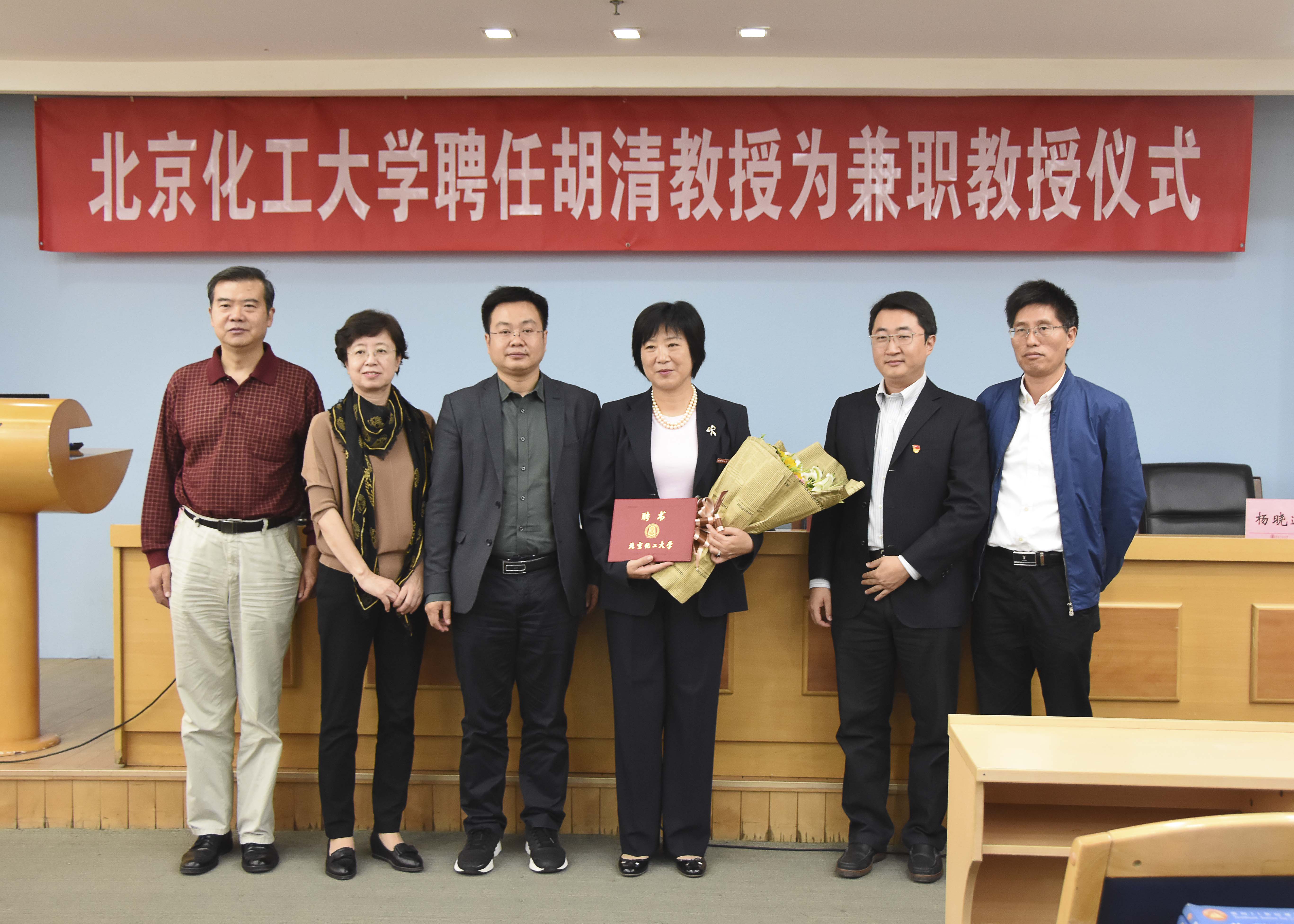 山岚书记介绍了胡清教授的履历及主要研究成果。任钟旗副校长为胡清教授颁发**教授聘书,学生代表为胡清教授献花并佩戴校徽。