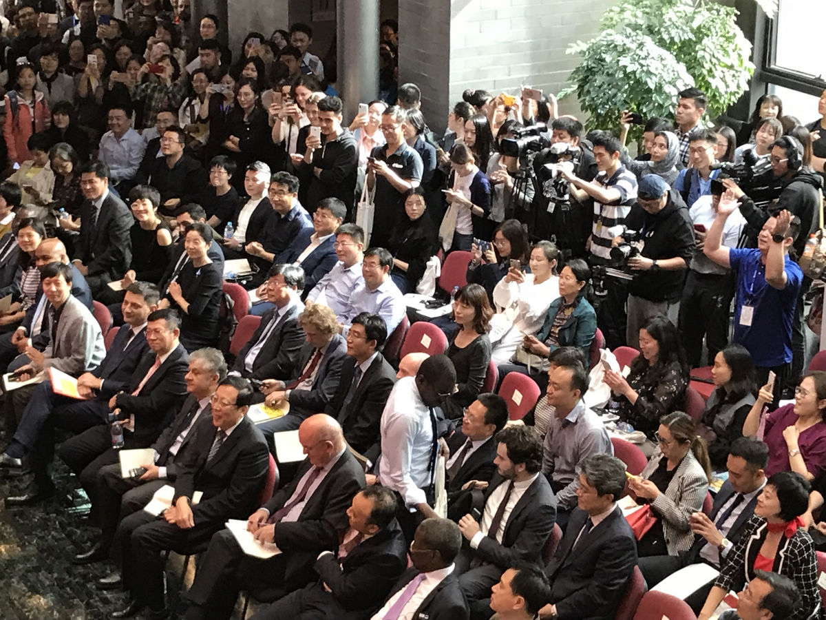 孔子学院总部党委书记、副总干事、国家汉办副主任马箭飞致欢迎辞。黑山共和国驻华大使达尔科•帕约维奇,环球时报副总编辑谢戎彬,阿里巴巴集团副总裁刘松分别致辞。孔子学院总部理事会常务理事、北京大学党委书记郝平宣布启动2018年孔子学院总部“开放日”。