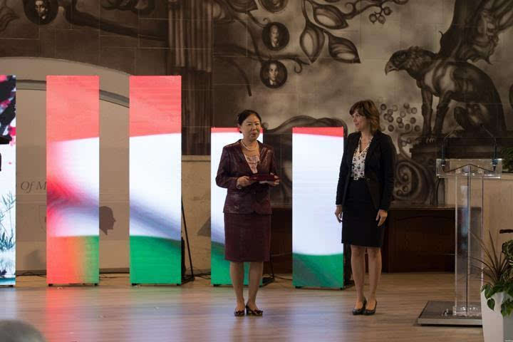 在庆典仪式上,为了表彰米大孔子学院前任中方院长朱晓苑的杰出工作,米大副校长Nóra Jakab代表学校向其颁发了米大特别贡献奖章。