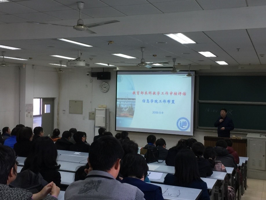 2018年11月9日下午,信息科学与技术学院在科技大厦科202召开了即将进行的教育部本科教学工作审核评估全体教师动员大会,会议由副院长李宏光主持,分党委书记李征、院长俞度立、副院长杜彬以及学院全体教师参加了会议。