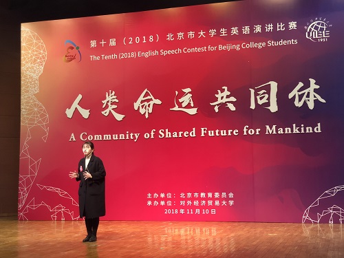 11 月10日,由北京市教委主办、对外经济贸易大学承办的第十届(2018)北京市大学生英语演讲比赛复赛与总决赛在对外经济贸易大学举行。本次大赛的主题是“A Community of Shared Future for Mankind”(人类命运共同体)。共有来自清华、北大、外交学院、北外、人大和我校等北京56所高校的56名选手参加此次比赛。