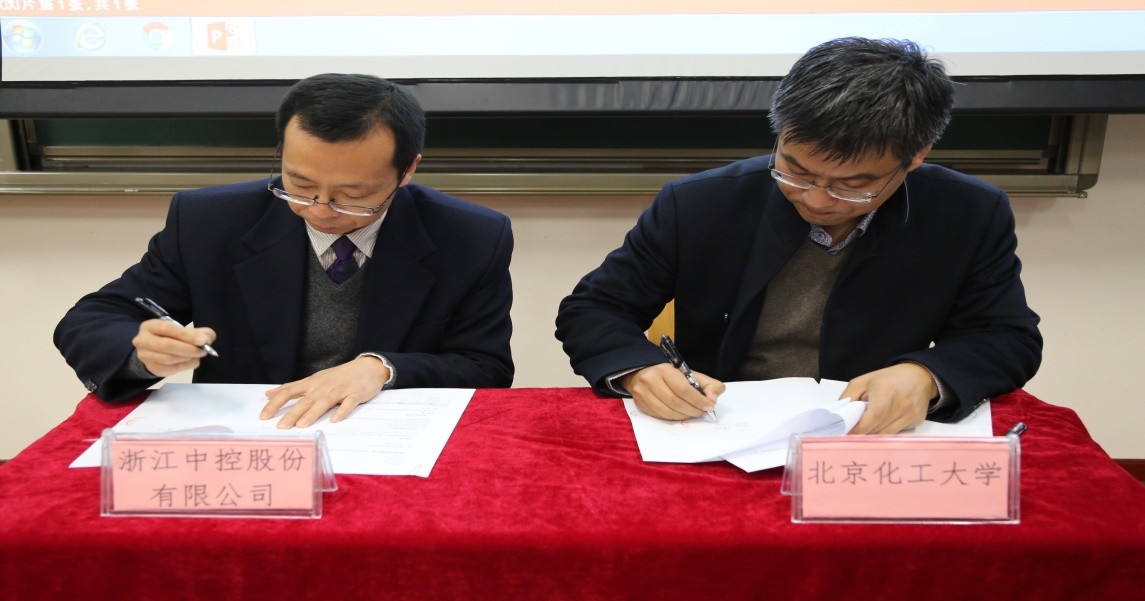 随后进行了北京化工大学—浙江中控奖学金续签约仪式,李征书记与仲卫涛先生互相交换合同并握手以表达继续加强友好合作的决心。
