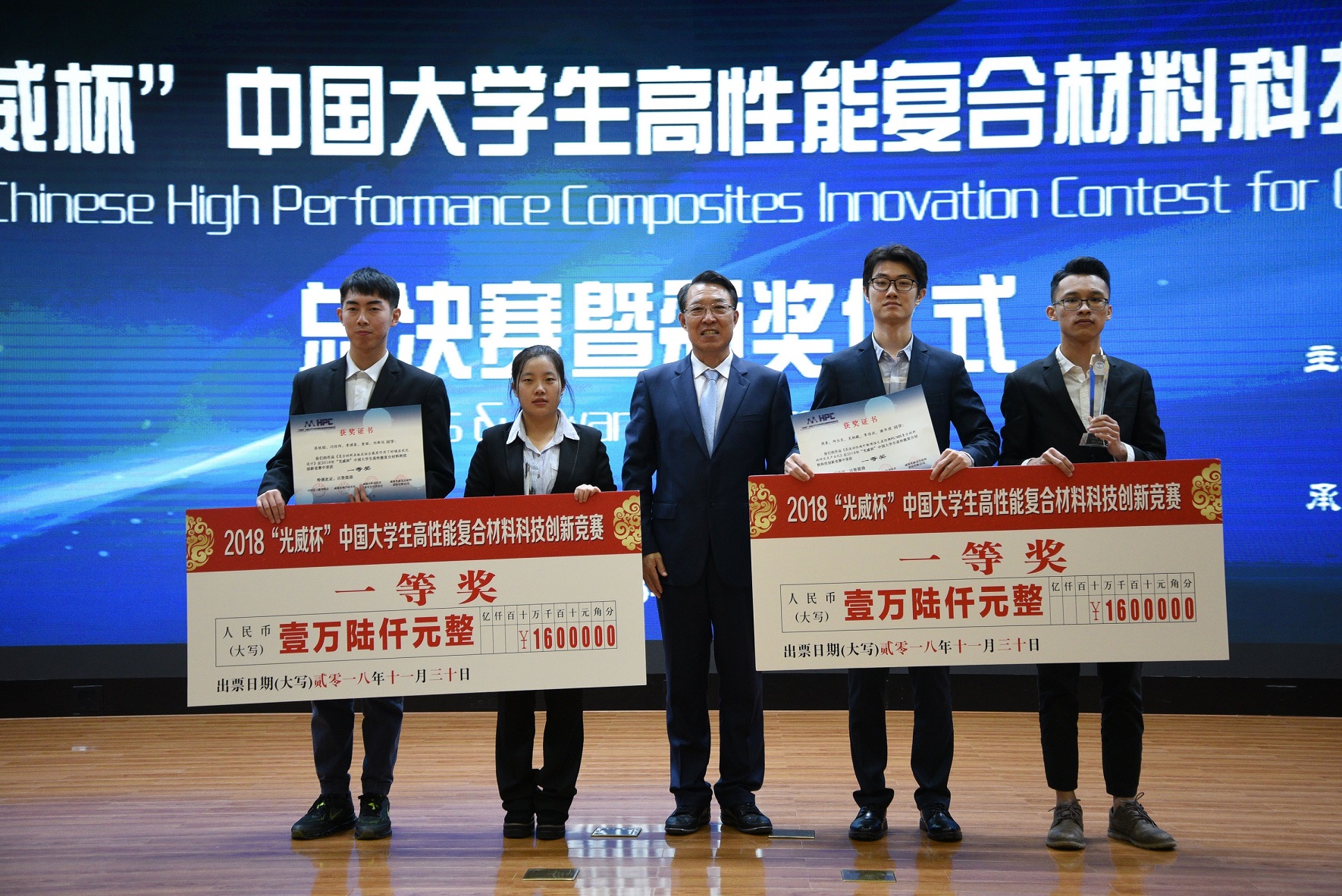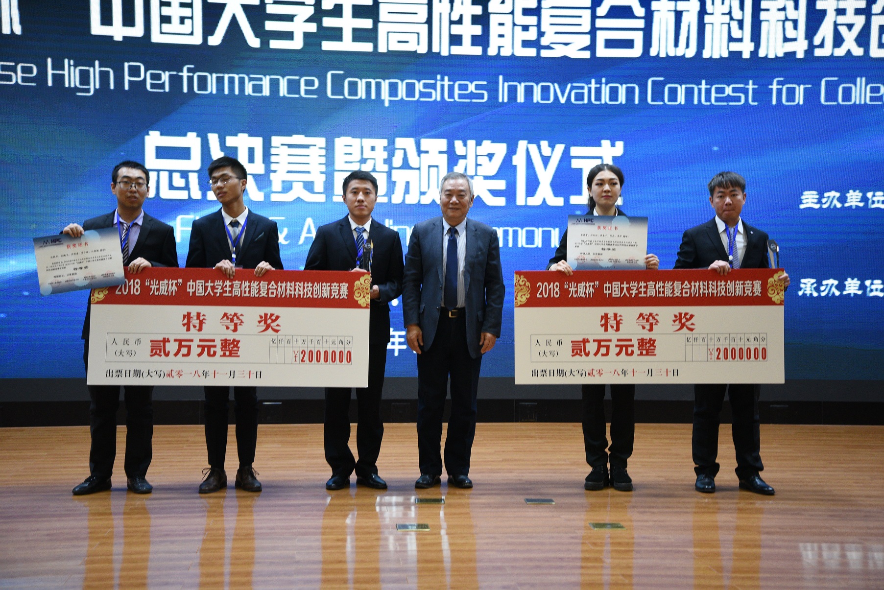 2018“光威杯”中国大学生高性能复合材料科技创新竞赛总决赛暨颁奖仪式在威海高区创新创业基地举行。中国化工教育协会会长郝长江,威海市火炬高技术产业开发区党工委书记、管委会主任刘伟,北京化工大学副校长任新钢,中国化工教育协会秘书长辛晓,威海市火炬高技术产业开发区管委会副主任孙法春,威海市科技局副局长王军伟,威海市高区科技局副局长兰涛,威海光威集团有限责任公司副总经理张利军,威海光威复合材料股份有限公司常务副总经理王文义,北京化工大学科研院常务副院长杨小平,材料学院常务副院长张晓丰,校团委书记丁贞栋,材料学院党委副书记李承明等参加活动,来自北京化工大学、哈尔滨工业大学、山东大学等高校师生代表及媒体代表、政府企业代表300余人参加颁奖仪式。