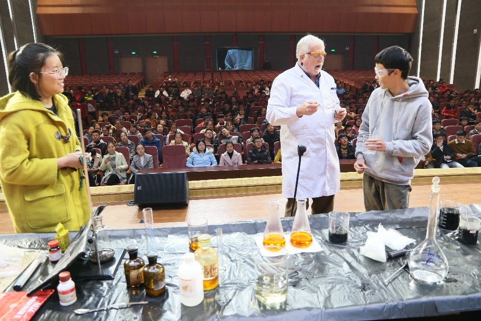David教授在各中学做了“双氧水丰富多彩的化学反应”高端科普报告。化学之美,在于那些精密的分子结构,在于那些奇形怪状的“瓶瓶罐罐”,更在于这些五光十色的化学反应。化学实验集化学知识、实验设计、动手操作于一体,培养学生合作探究的意识、独立思考的能力以及敢于质疑和批判的创新精神,这正是化学学科核心素养的重要内容。David教授通过生活中常见的化学药品,利用浅显的化学反应引出生活中无处不在的化学反应,之后David教授以“变色反应”、“时钟反应”、“震荡反应”、“发光反应”、“歧化反应”五组十个化学实验的神奇效果,结合相关理论知识的讲解,将深奥的化学原理用通俗易懂和趣味奇幻的形式进行了重新诠释,极大地激发了在场学生对学习化学的浓厚兴趣。David教授幽默的语言、严谨的推理、精彩的演示和教学相长的师生互动,博得广**生的阵阵掌声。